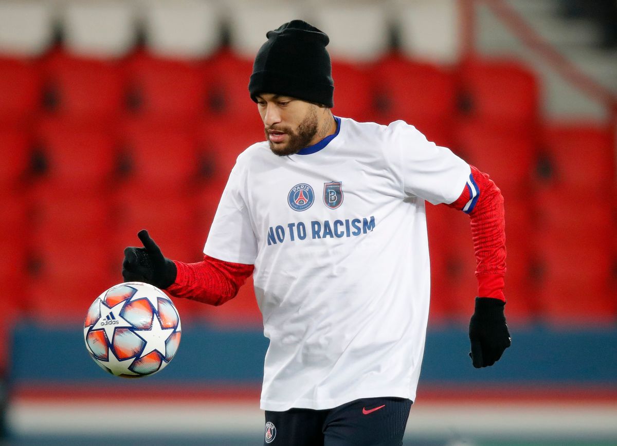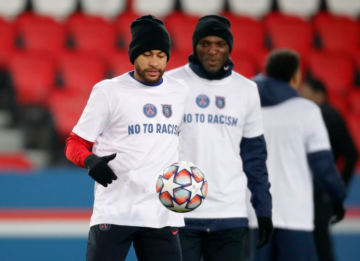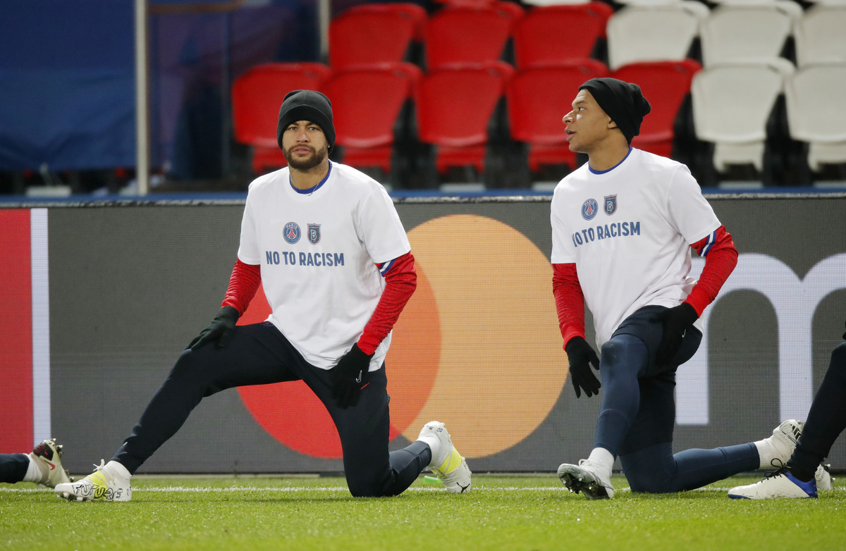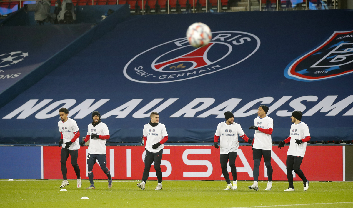 Paris St Germain and Istanbul Basaksehir players, as well as the three onfield match officials, took a knee before their Champions League game resumed on Wednesday after being suspended the day before.