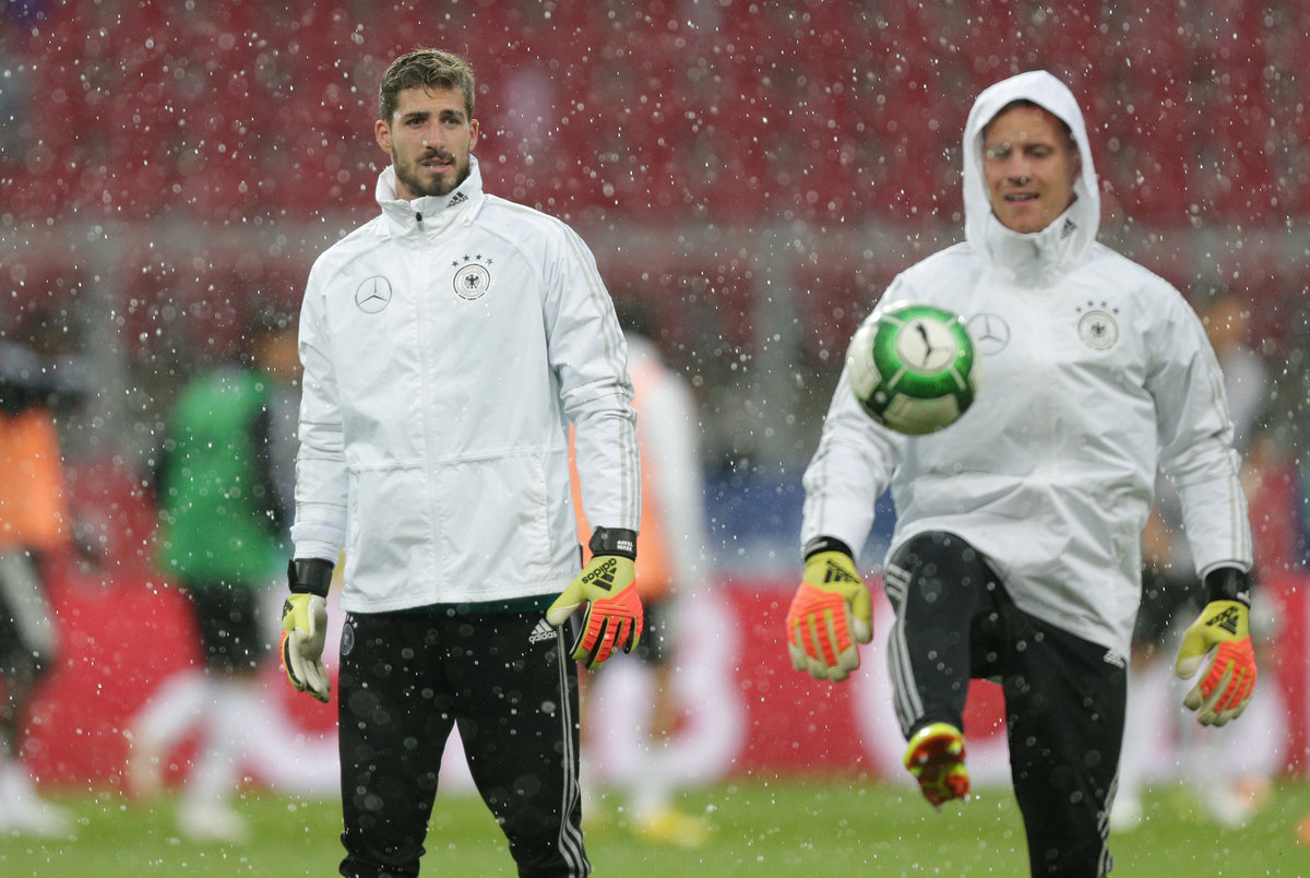 Soccer Football - International Friendly - Austria vs Germany - Worthersee Stadion, Klagenfurt, Austria - June 2, 2018 General view of Germany’s Kevin Trapp in the rain as the match is delayed due to a waterlogged pitch REUTERS/Lisi Niesner