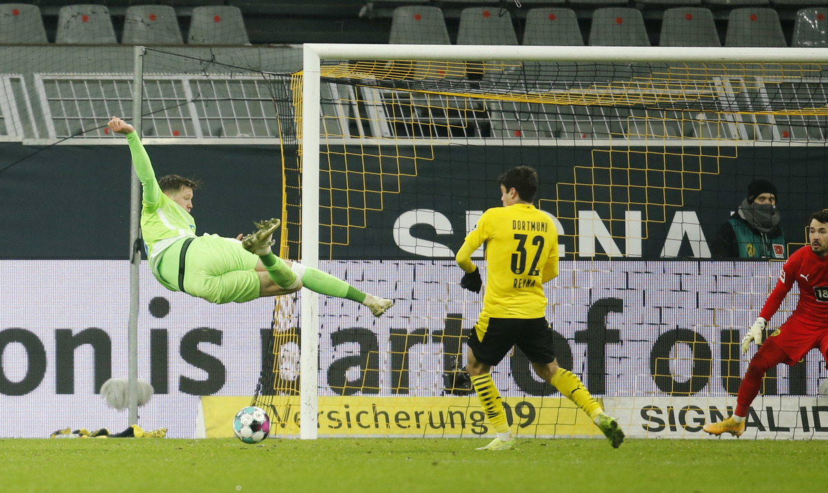 Striker Eriling Haaland, who missed Dortmund's previous four league games with a hamstring injury, twice forced spectacular saves from Casteels, the first of which, just before halftime, was scuffed wide on the rebound by Sancho.