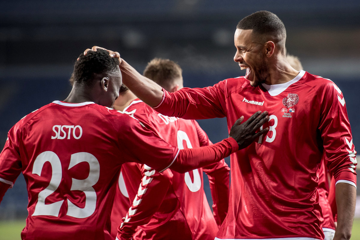 Soccer - International Friendly - Denmark v Panama - Broendby stadium, Copenhagen, Denmark - March 22, 2018. Denmark's Pione Sisto scores and celebrates with Denmark's Mathias Zanka Joergensen during the friendly soccer football match. Ritzau Scanpix/Mads Claus Rasmussen via REUTERS