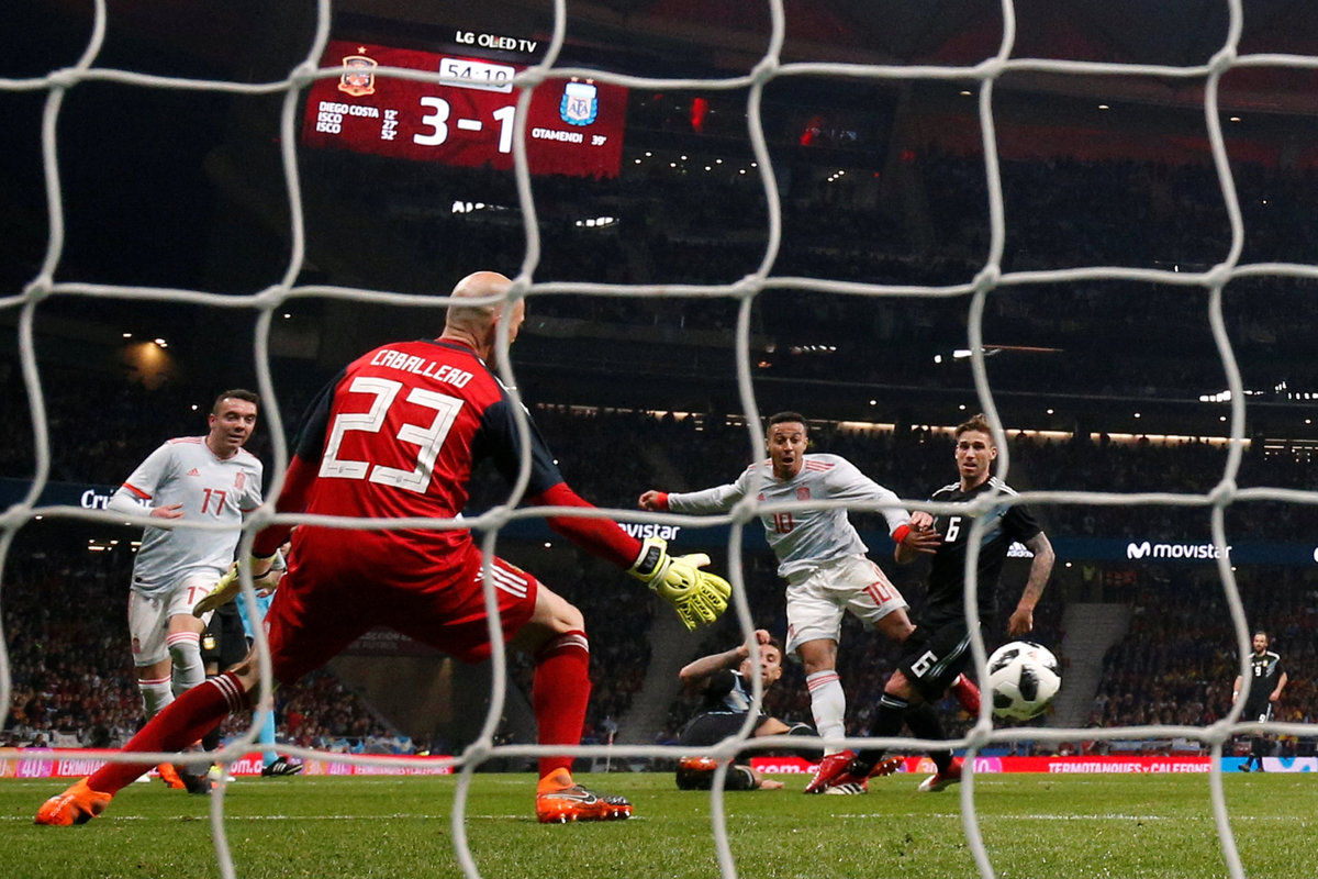 Romero’s replacement, Chelsea back-up Willy Caballero, who starred in Friday’s 2-0 win over Italy, suffered a nightmare. A wayward pass with his first touch saw Isco gleefully sweep home Spain’s second in the 27th as they threatened to run riot.