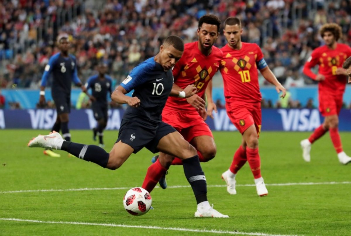 France's Kylian Mbappe in action with Belgium's Eden Hazard and Jan Vertonghen.