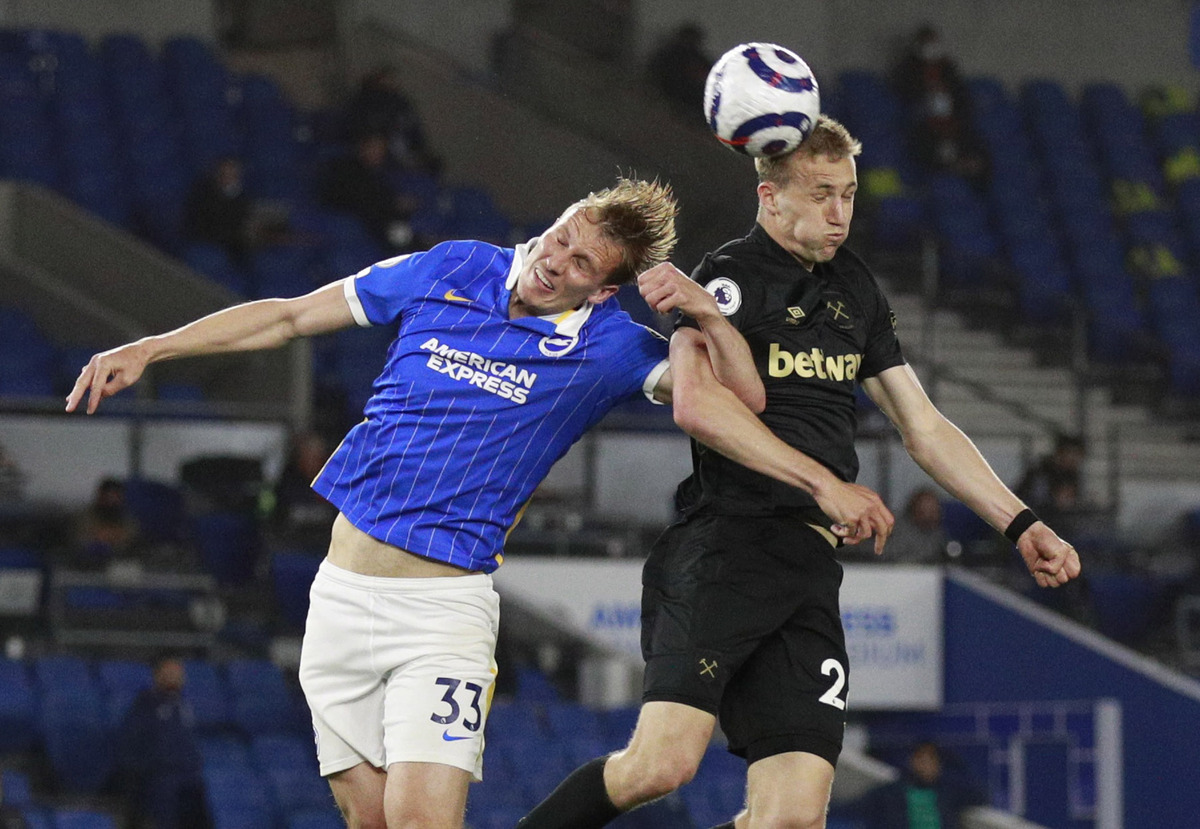 West Ham United's fading hopes of finishing in the Premier League's top four suffered another setback when they were held to a 1-1 draw at lowly Brighton & Hove Albion on Saturday.