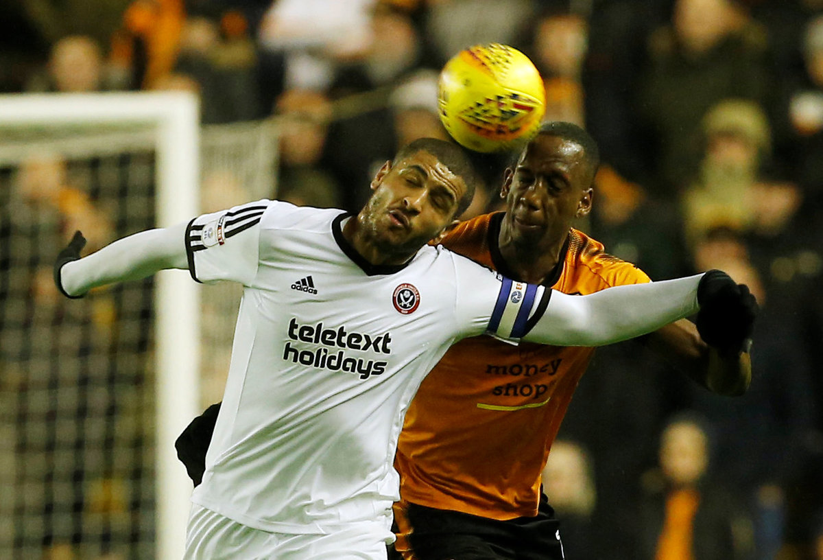 Soccer Football - Championship - Wolverhampton Wanderers vs Sheffield United - Molineux Stadium, Wolverhampton, Britain - Febraury 3, 2018 Sheffield United's Leon Clarke (L) in action with Wolves' Willy Boly Action Images/Craig Brough