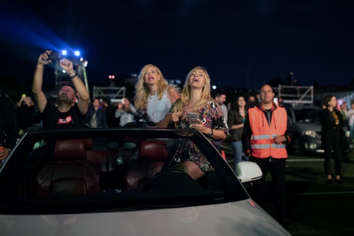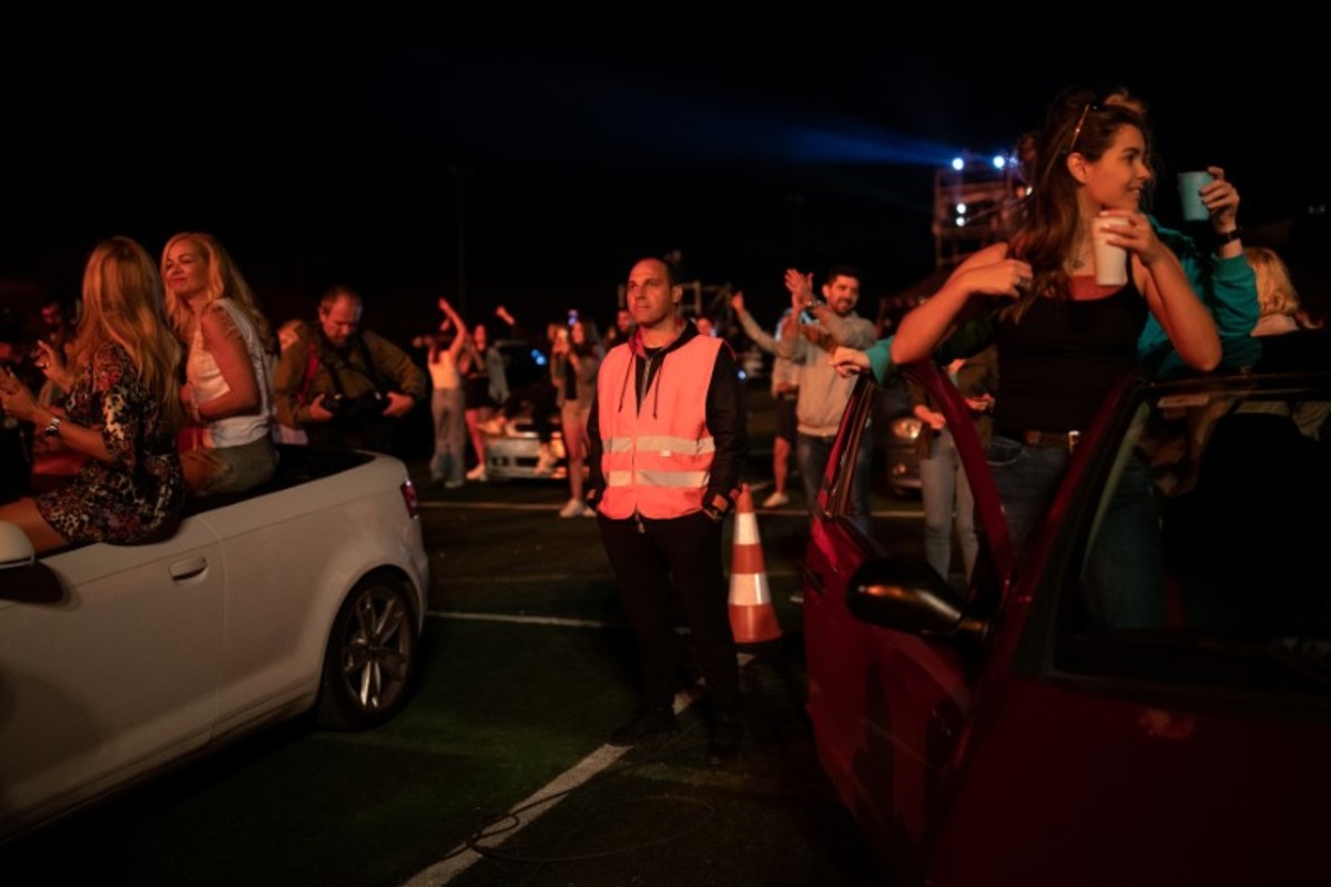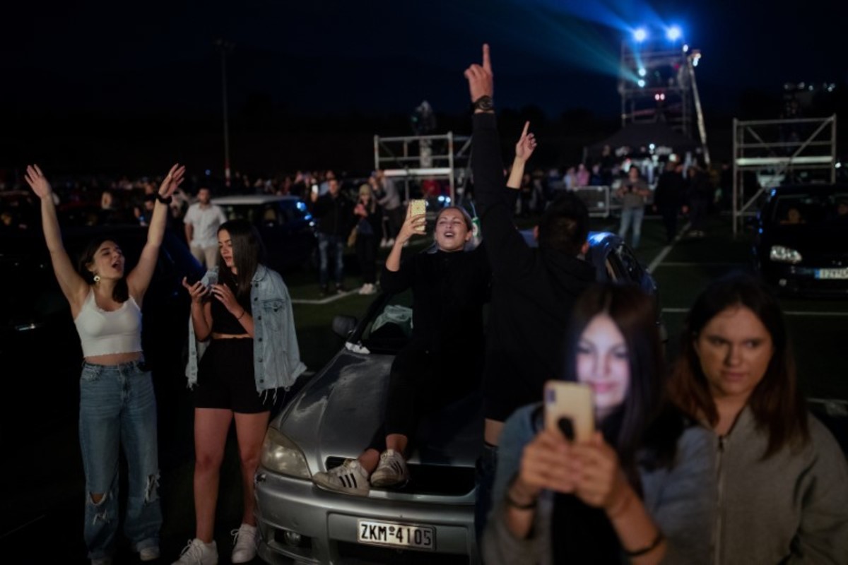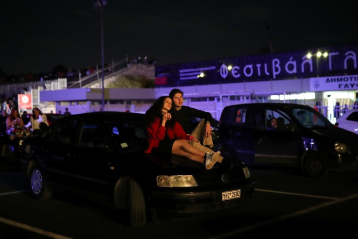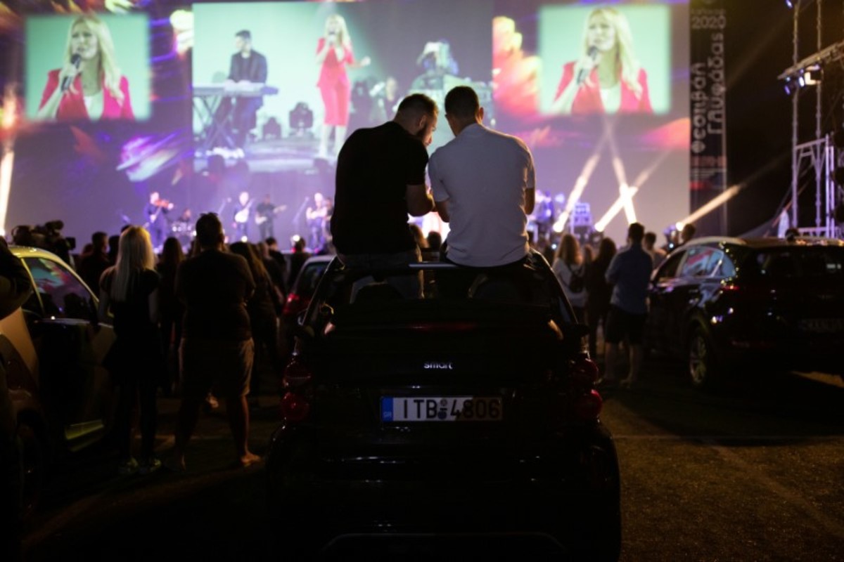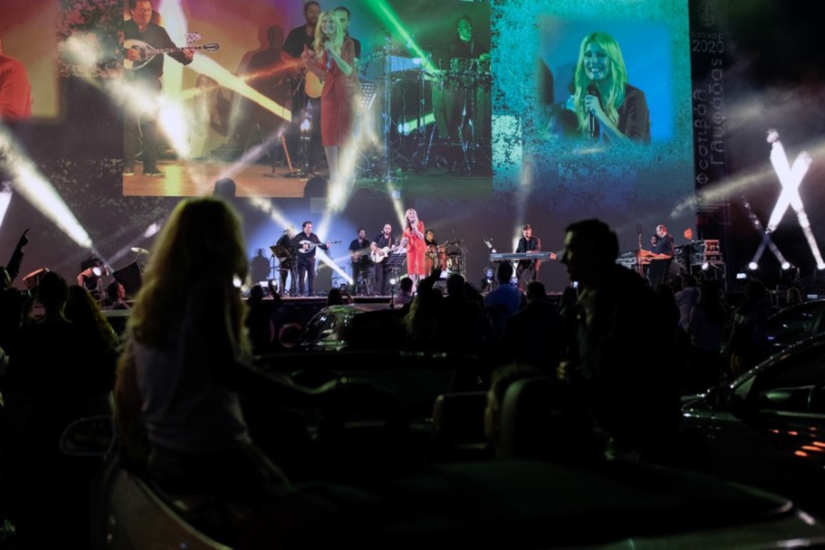 Emerging from sunroofs or sitting on the hood of vehicles parked at designated slots in a soccer stadium in the Athens seaside suburb of Glyfada on Tuesday night, spectators enjoyed a free performance by popular Greek singer Natasa Theodoridou.