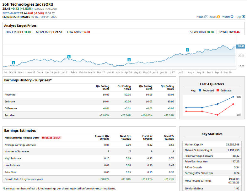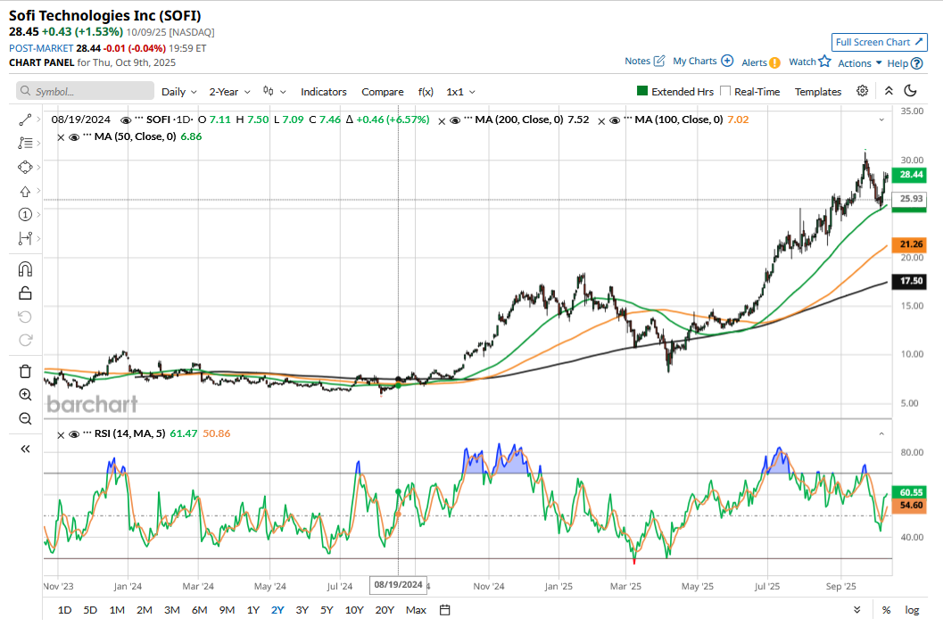 However, it hasn’t been a one-directional move, and SoFi has been particularly volatile this year. The stock bottomed at $8.60 in April amid the tariff chaos and has since risen by over 220%. While short-term trading has never been my forte, I believe SoFi stock provides a lot of opportunities for short-term trades given its volatile nature.