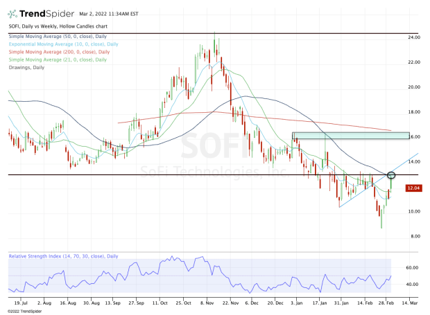 From here, I’d like to see the stock clear the 50-day. If it can do that, I think $16 to $16.50 is a real possibility. That’s where SoFi stock will find prior resistance and the declining 200-day.
