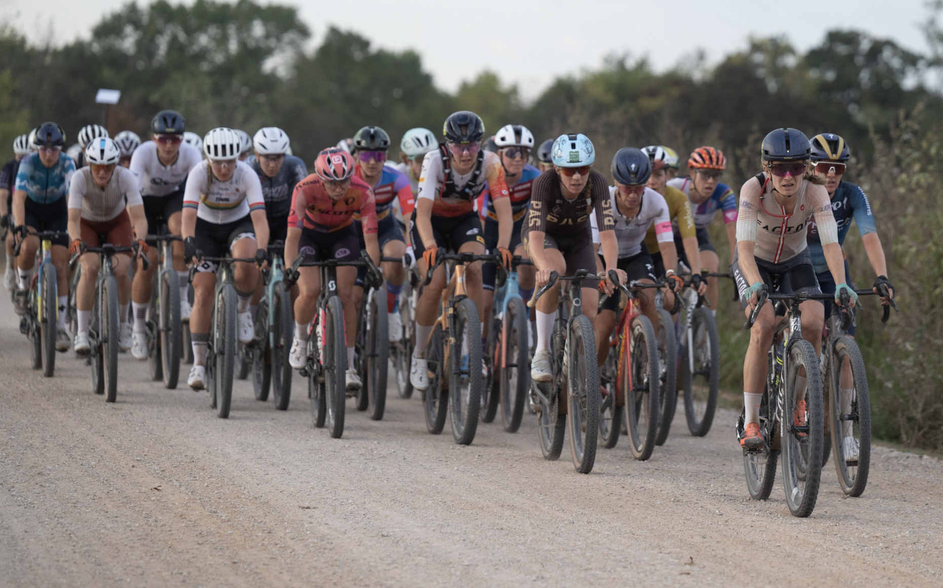 With a weather forecast that included 'large hail and damaging wind gusts' with up to two inches of steady rain, Life Time cut the 100-mile route in half on Saturday morning for all riders on the original 100-mile route. Now 50 miles in length, the elite women took the start at 7:35 a.m. local time, 10 minutes after the elite men, under partly cloudy skies on rough dirt roads on the Missouri side of the counter-clockwise circuit.