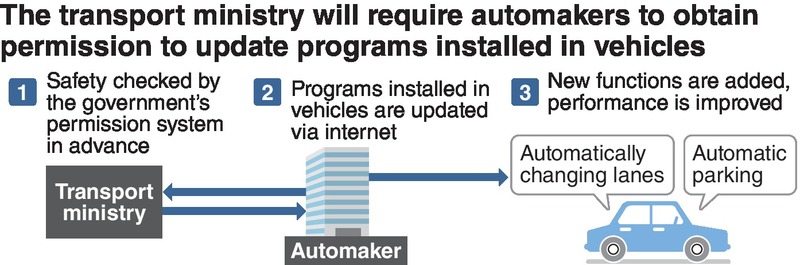 The Land, Infrastructure, Transport and Tourism Ministry plans to require automakers to obtain the government's permission if they update the programs of systems installed in their vehicles, with the aim to confirm in advance the safety of such expected updates as adding self-driving functions to change lanes on expressways.
