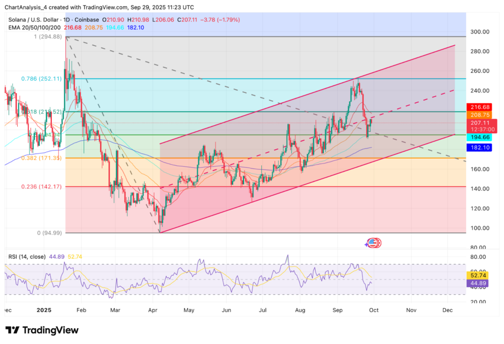 Technical analysis: Solana is consolidating near $207 after pulling back from the $250 resistance zone, with price holding inside a well-defined ascending channel.