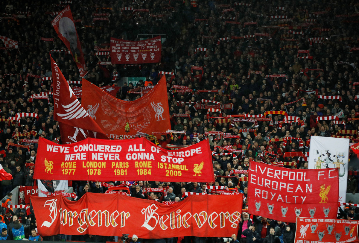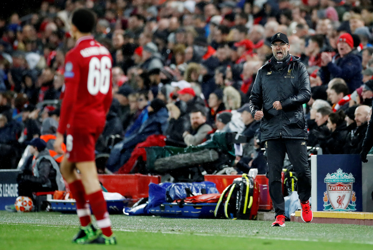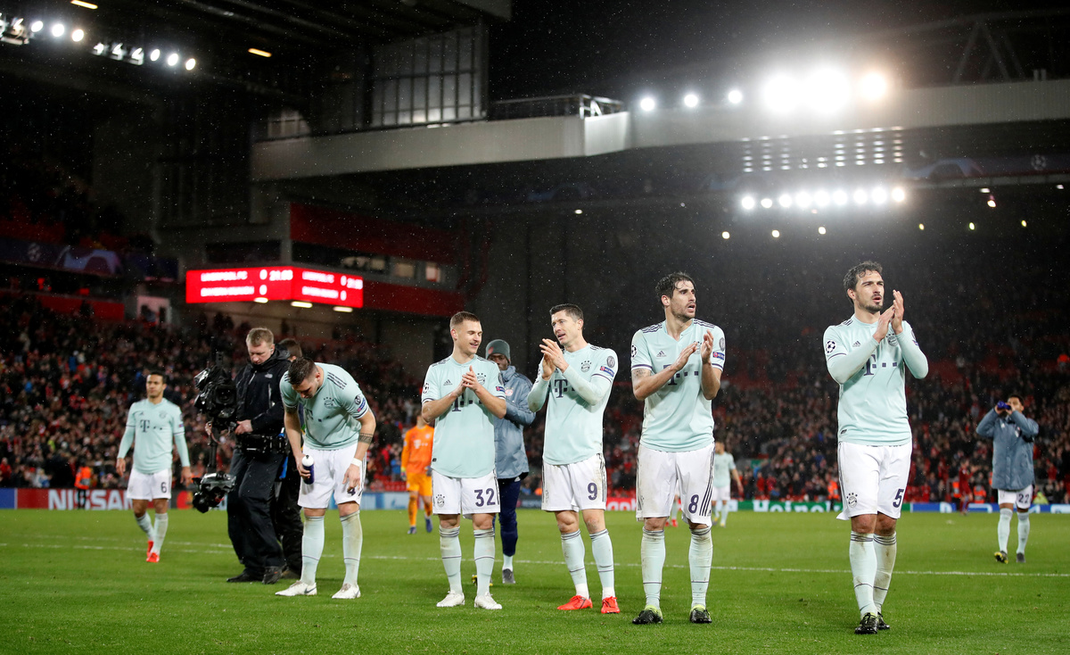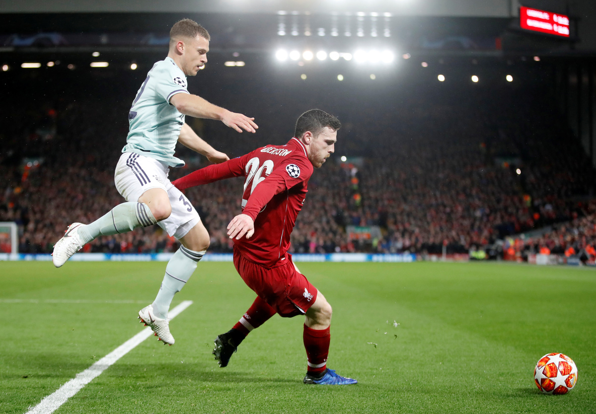 Soccer Football - Champions League - Round of 16 First Leg - Liverpool v Bayern Munich - Anfield, Liverpool, Britain - February 19, 2019 Liverpool manager Juergen Klopp and Liverpool's Trent Alexander-Arnold during the match Action Images via Reuters/Carl RecineSoccer Football - Champions League - Round of 16 First Leg - Liverpool v Bayern Munich - Anfield, Liverpool, Britain - February 19, 2019 Liverpool manager Juergen Klopp speaks with Bayern Munich coach Niko Kovac after the match Action Images via Reuters/Carl RecineSoccer Football - Champions League - Round of 16 First Leg - Liverpool v Bayern Munich - Anfield, Liverpool, Britain - February 19, 2019 Liverpool's Mohamed Salah misses a chance to score Action Images via Reuters/Carl RecineSoccer Football - Champions League - Round of 16 First Leg - Liverpool v Bayern Munich - Anfield, Liverpool, Britain - February 19, 2019 Liverpool fans REUTERS/Phil NobleSoccer Football - Champions League - Round of 16 First Leg - Liverpool v Bayern Munich - Anfield, Liverpool, Britain - February 19, 2019 Liverpool's Sadio Mane shoots at goal Action Images via Reuters/Carl RecineSoccer Football - Champions League - Round of 16 First Leg - Liverpool v Bayern Munich - Anfield, Liverpool, Britain - February 19, 2019 Liverpool's Joel Matip, Jordan Henderson and Naby Keita in action with Bayern Munich's Robert Lewandowski REUTERS/Phil NobleSoccer Football - Champions League - Round of 16 First Leg - Liverpool v Bayern Munich - Anfield, Liverpool, Britain - February 19, 2019 Bayern Munich's Joshua Kimmich, Robert Lewandowski and team mates applaud fans after the match Action Images via Reuters/Carl RecineSoccer Football - Champions League - Round of 16 First Leg - Liverpool v Bayern Munich - Anfield, Liverpool, Britain - February 19, 2019 Bayern Munich's Joshua Kimmich in action with Liverpool's Andrew Robertson Action Images via Reuters/Carl RecineSoccer Football - Champions League - Round of 16 First Leg - Liverpool v Bayern Munich - Anfield, Liverpool, Britain - February 19, 2019 Liverpool's Joel Matip, Jordan Henderson and Naby Keita in action with Bayern Munich's Robert Lewandowski Action Images via Reuters/Carl RecineSoccer Football - Champions League - Round of 16 First Leg - Liverpool v Bayern Munich - Anfield, Liverpool, Britain - February 19, 2019 Liverpool players pose for a team group photo before the match REUTERS/Phil NobleSoccer Football - Champions League - Round of 16 First Leg - Liverpool v Bayern Munich - Anfield, Liverpool, Britain - February 19, 2019 Bayern Munich players pose for a team group photo before the match Action Images via Reuters/Carl Recine