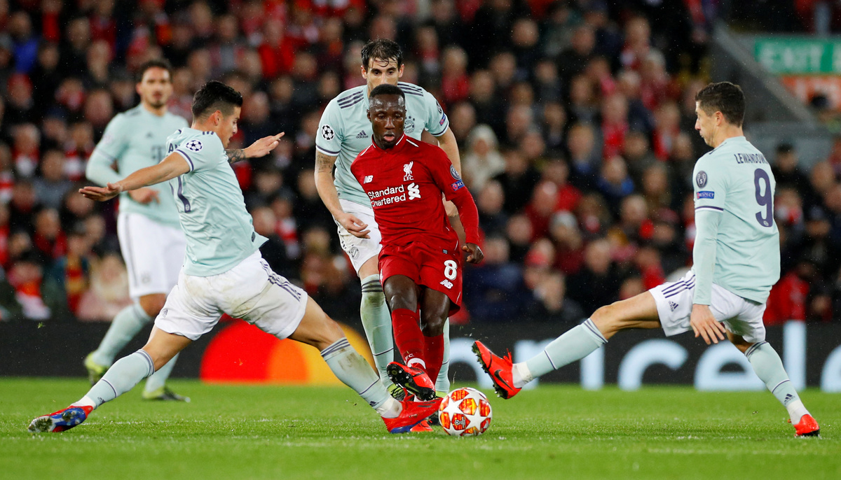 Soccer Football - Champions League - Round of 16 First Leg - Liverpool v Bayern Munich - Anfield, Liverpool, Britain - February 19, 2019 Liverpool's Naby Keita in action with Bayern Munich's James Rodriguez and Robert Lewandowski REUTERS/Phil Noble