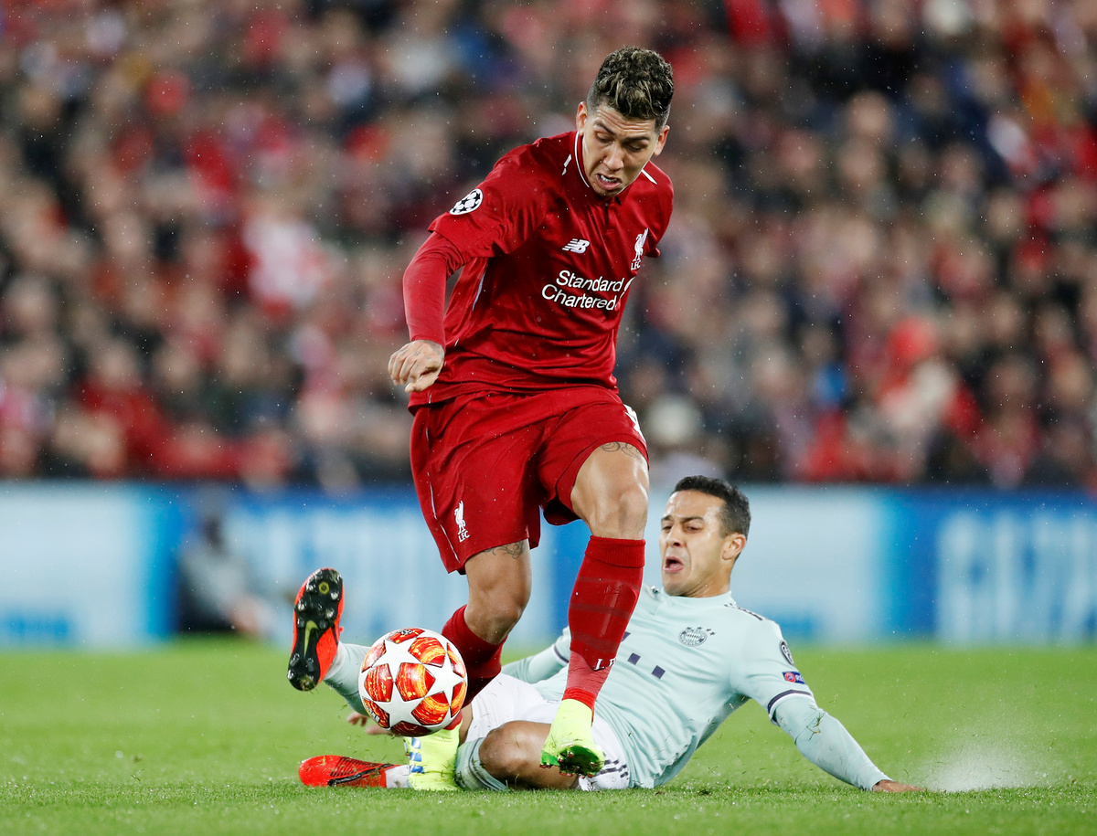 Soccer Football - Champions League - Round of 16 First Leg - Liverpool v Bayern Munich - Anfield, Liverpool, Britain - February 19, 2019 Liverpool's Roberto Firmino in action with Bayern Munich's Thiago Action Images via Reuters/Carl Recine