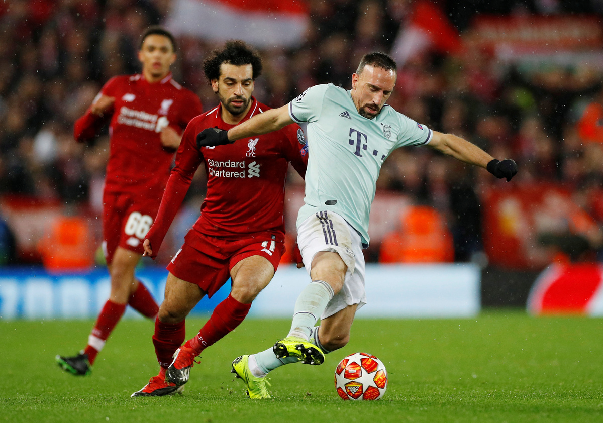 Soccer Football - Champions League - Round of 16 First Leg - Liverpool v Bayern Munich - Anfield, Liverpool, Britain - February 19, 2019 Bayern Munich's Franck Ribery in action with Liverpool's Mohamed Salah REUTERS/Phil Noble