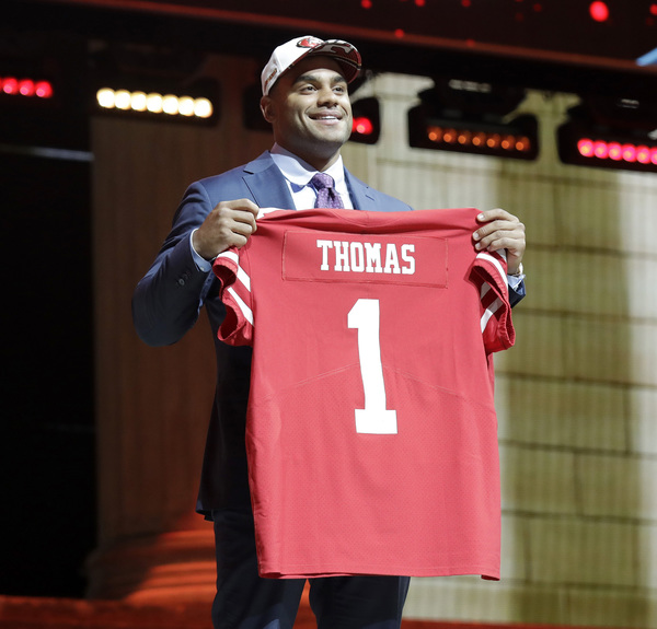 The 49ers drafted Thomas, a Stanford star, No. 3 overall after trading out of the No. 2 slot with the Chicago Bears, who also sent them a third-round pick, a fourth-rounder and a 2018 third-round choice.