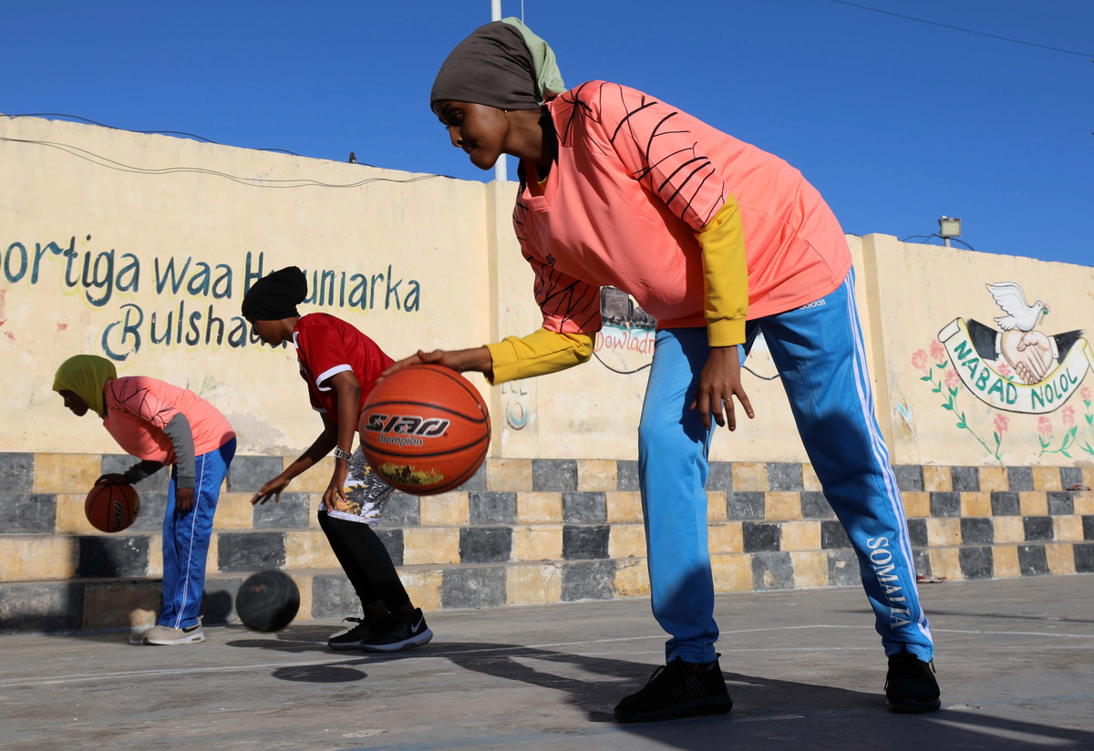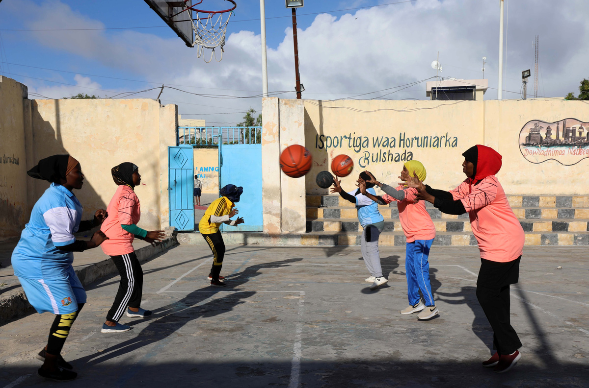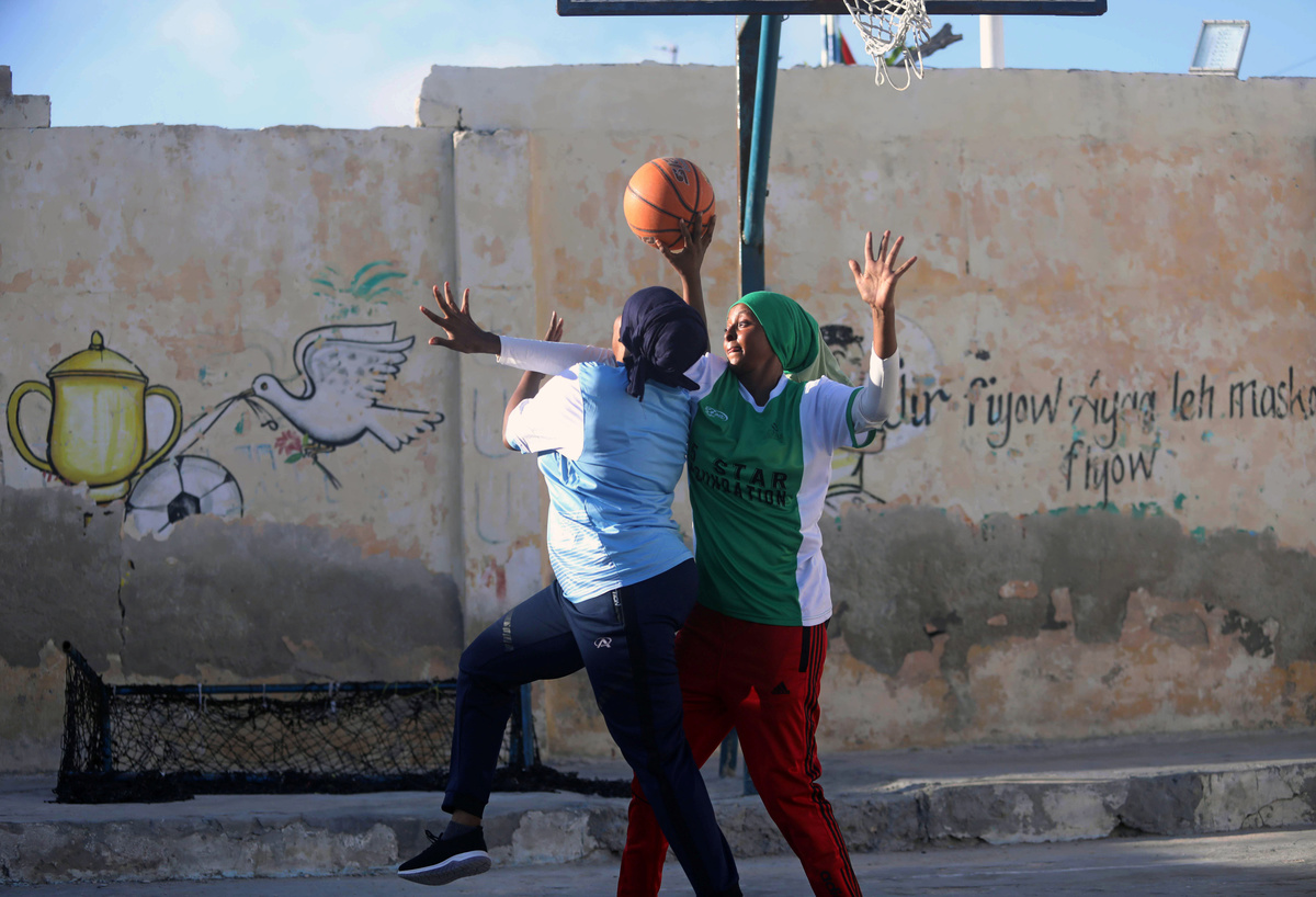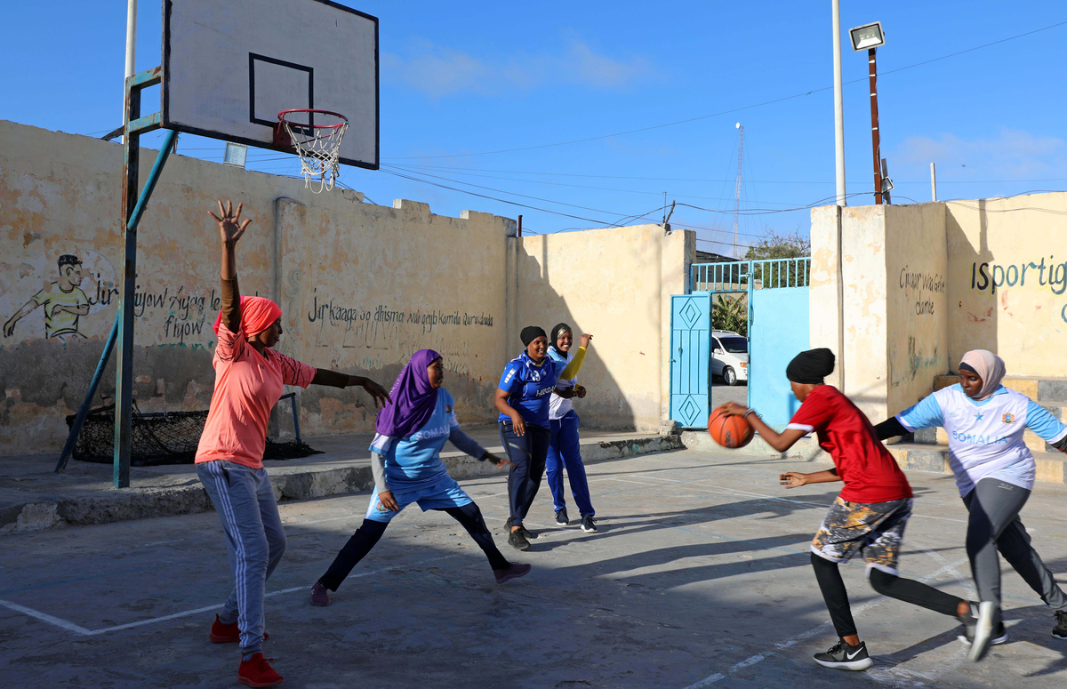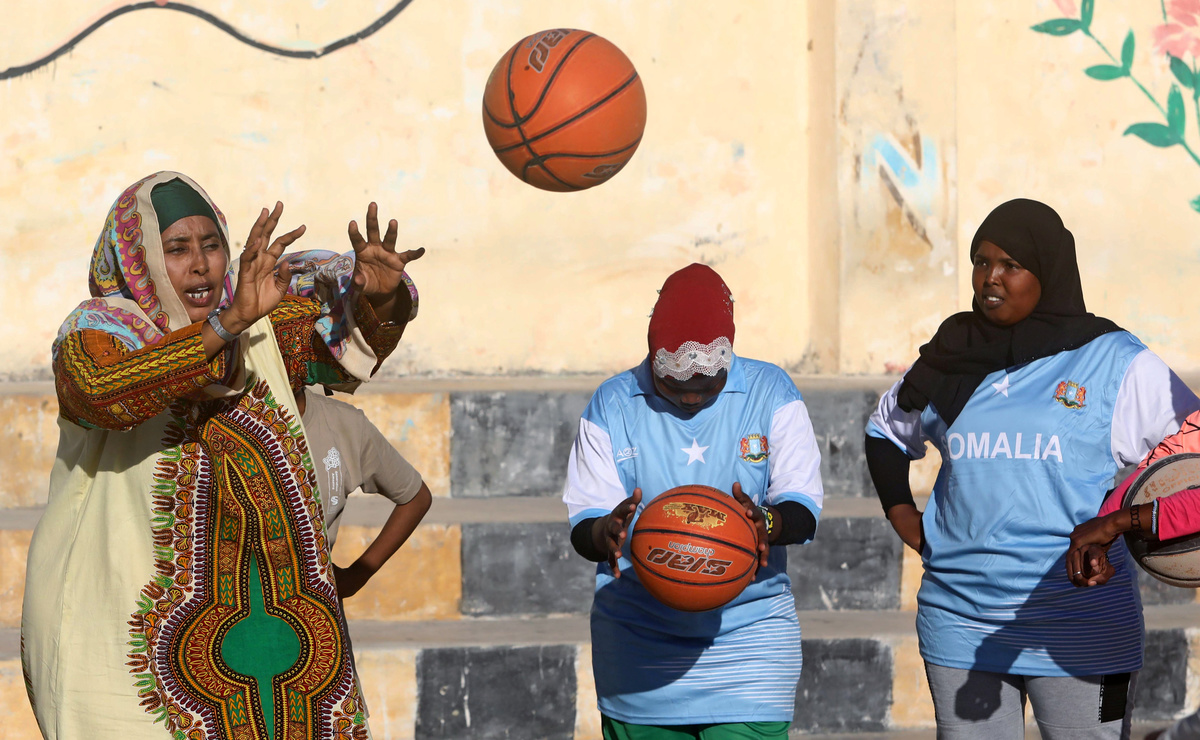 Whistles screech on the sea breeze as three female Somali coaches inspect a line of women in black and blue headscarves dribbling basketballs.