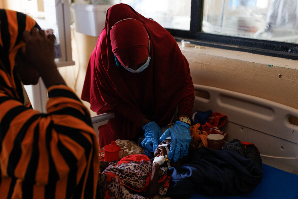 "From the long starvation, he's lost all his muscles, his fats. He cannot swallow properly," says Dr. Mohamed Yasin Hirey, standing next to the emaciated boy's bedside in the pediatric malnutrition intensive care unit. "This child is two years old and his weight is only 5.4 [kilograms]" — just under 12 pounds. "This is the weight of a normal two-month-old."