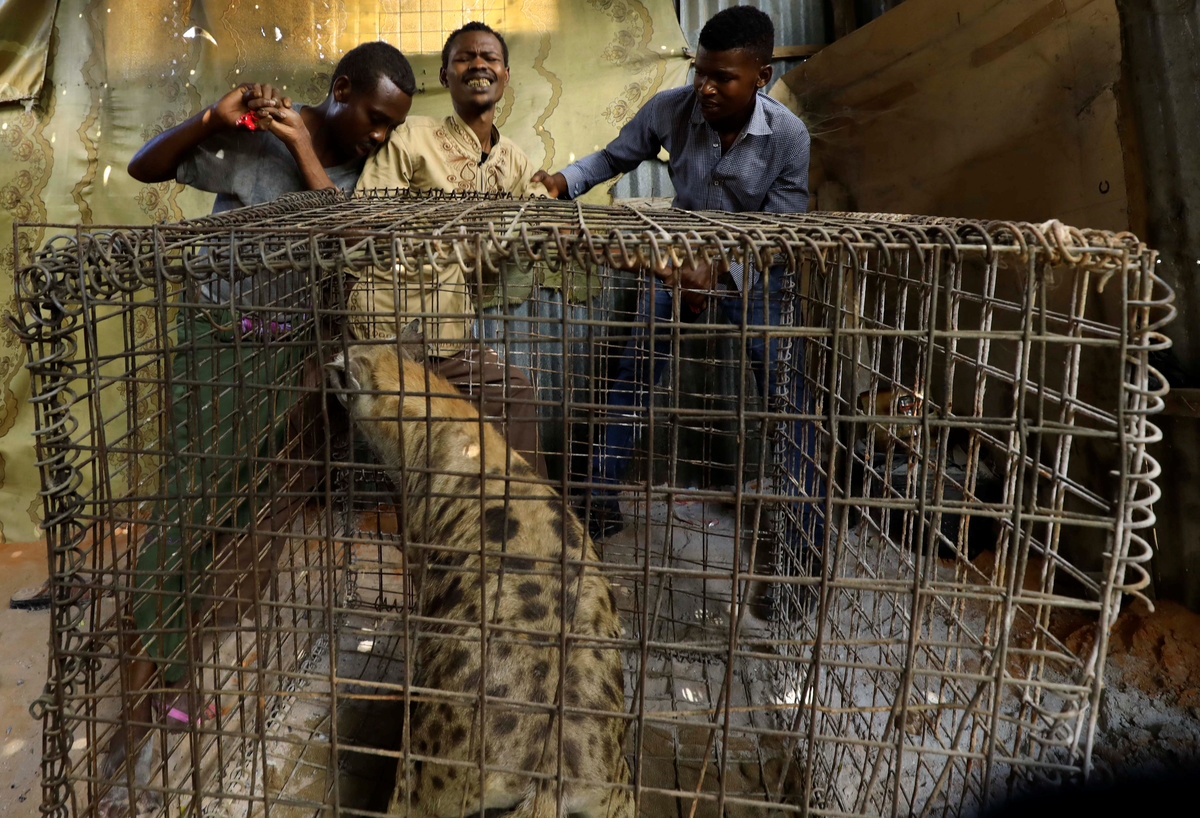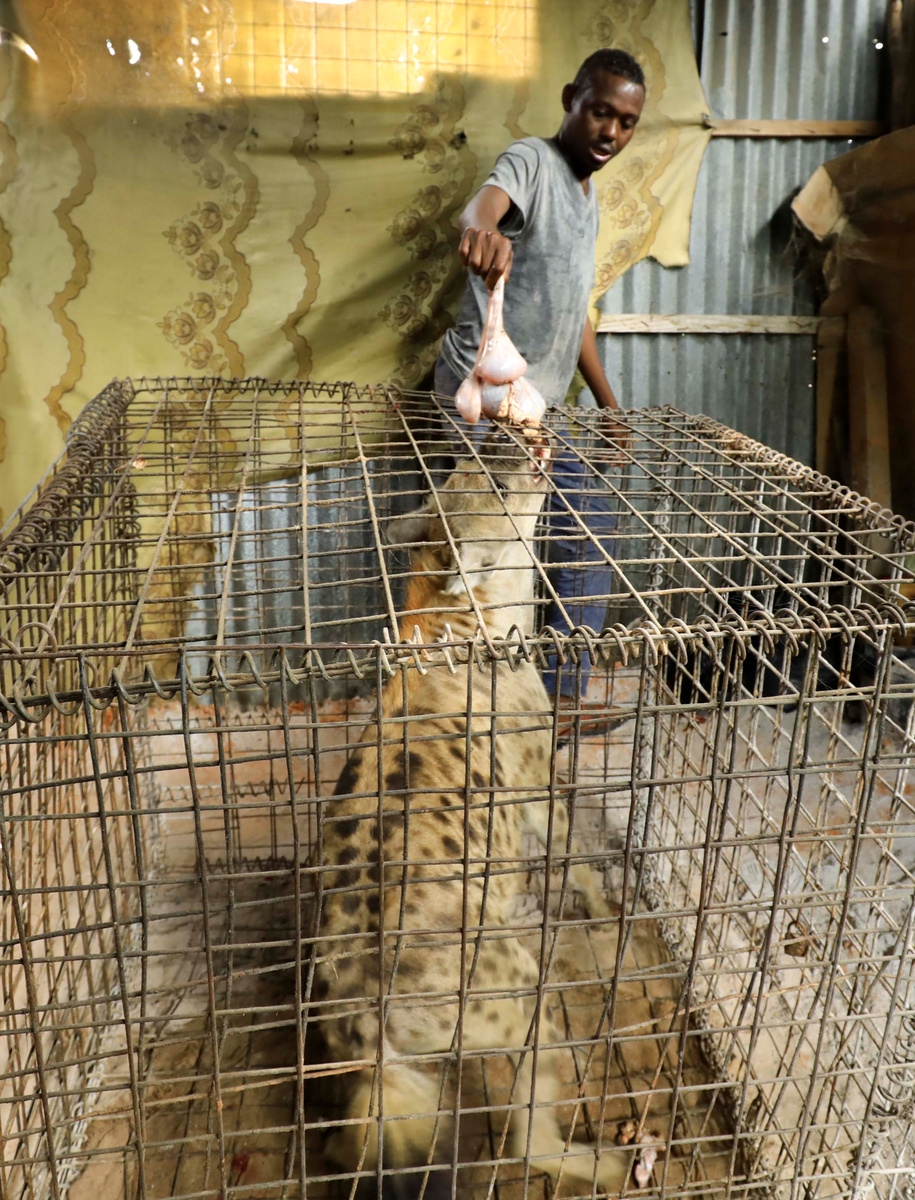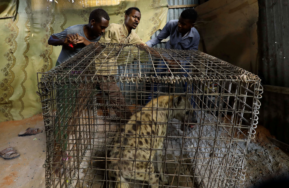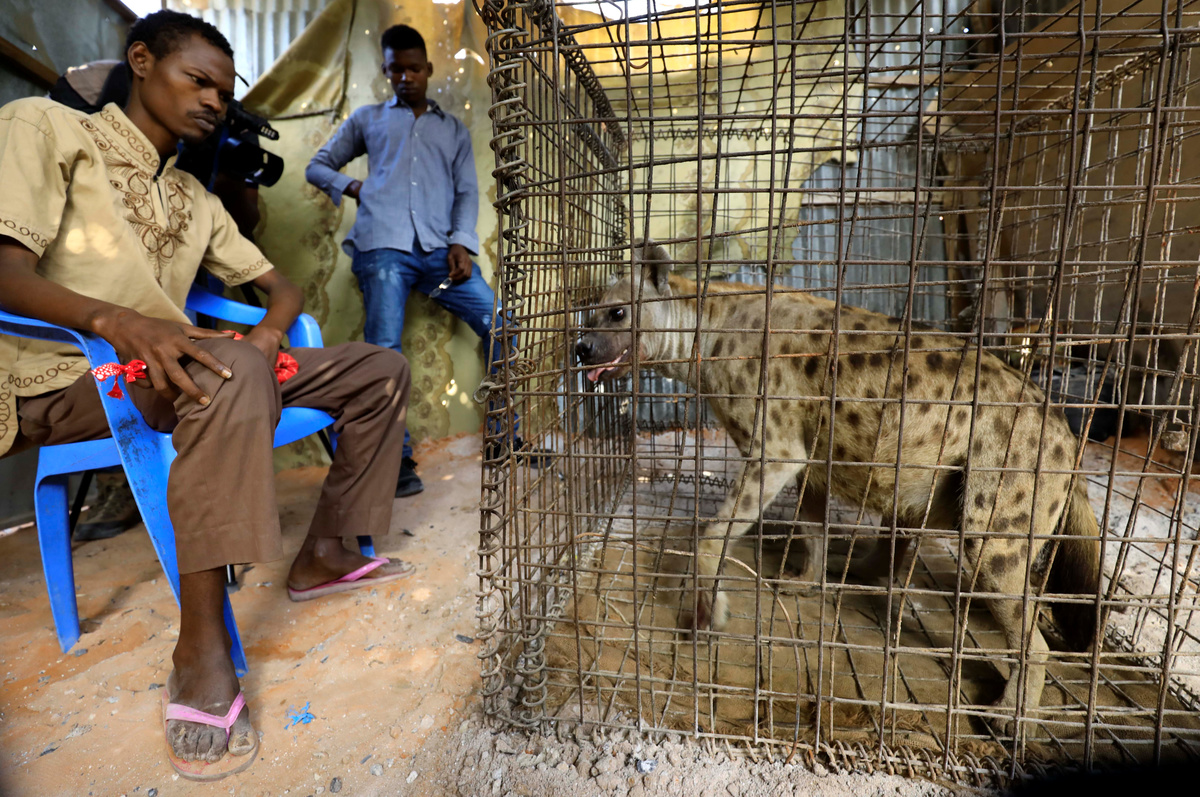 Abdikadir Ibrahim, a keeper, feeds a caged hyena believed to exorcise evil spirits that cause mental illness, inside a treatment room in Hodan district of Mogadishu, Somalia February 17, 2020. Picture taken February 17, 2020. REUTERS/Feisal OmarA hyena named Ali, believed to exorcise evil spirits that cause mental illness, is seen caged inside a treatment room in Hodan district of Mogadishu, Somalia February 15, 2020. Picture taken February 15, 2020. REUTERS/Feisal OmarMohamed Sheikh Yakub, a patient suffering with mental illness, sits outside the treatment room where a hyena believed to exorcise evil spirits that cause mental illness is secured, in Hodan district of Mogadishu, Somalia February 15, 2020. Picture taken February 15, 2020. REUTERS/Feisal OmarMohamed Sheikh Yakub, a patient suffering with mental illness, is escorted to the treatment room where a hyena believed to exorcise evil spirits that cause mental illness is secured, in Hodan district of Mogadishu, Somalia February 15, 2020. Picture taken February 15, 2020. REUTERS/Feisal OmarMohamed Sheikh Yakub, a patient suffering with mental illness, is assisted outside the treatment room where a hyena believed to exorcise evil spirits that cause mental illness is secured, in Hodan district of Mogadishu, Somalia February 15, 2020. Picture taken February 15, 2020. REUTERS/Feisal Omar