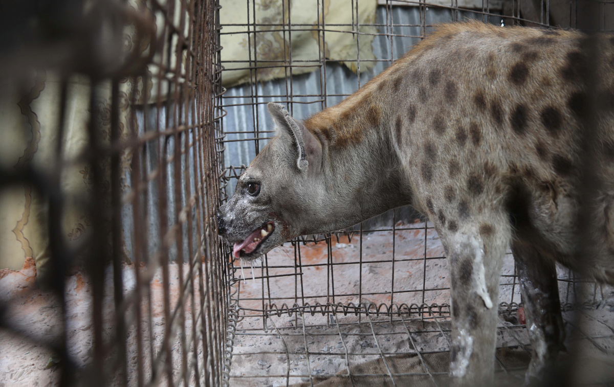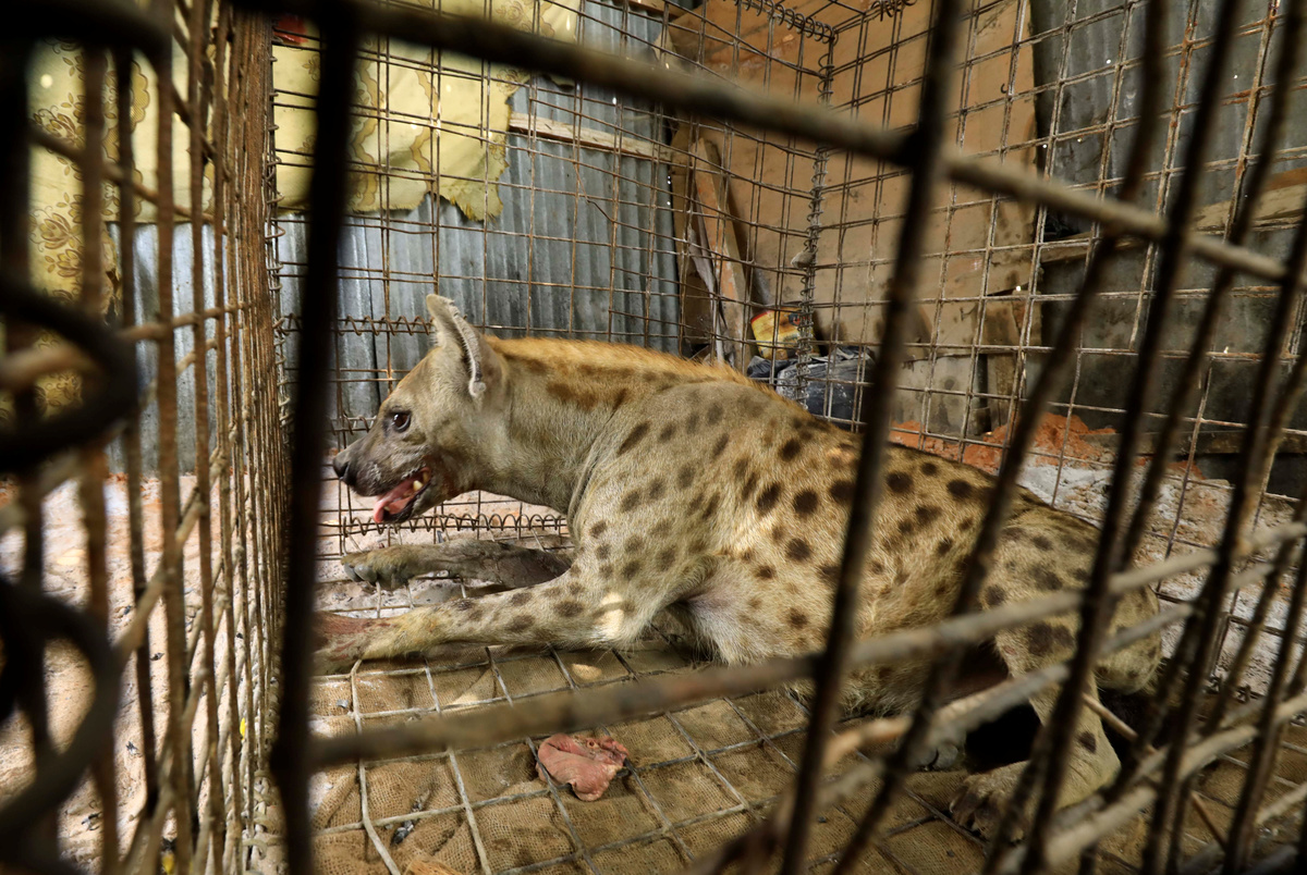 The growls from the caged hyena reverberate through the room as Mohamed Sheikh Yakub slumps silently in a chair nearby, hoping the animal will frighten away the evil spirits he says have troubled him since his divorce.