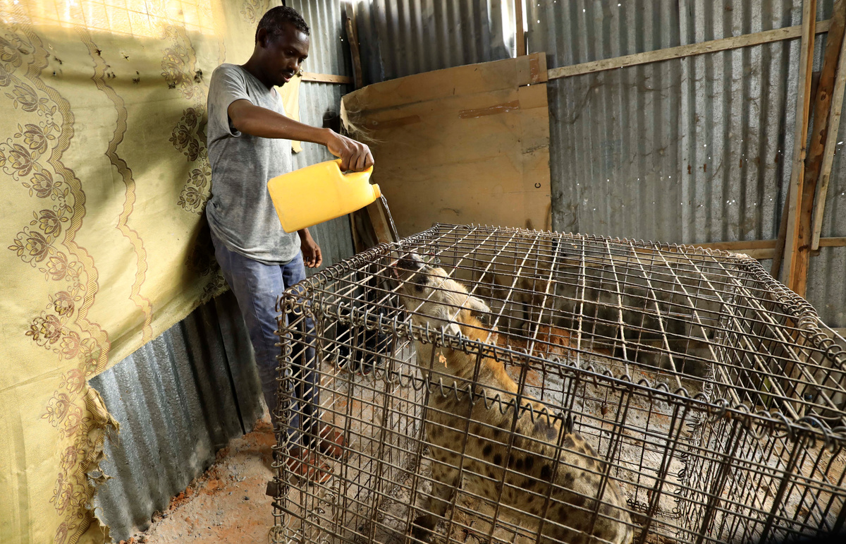 Abdikadir Ibrahim a keeper, gives water to a caged hyena believed to exorcise evil spirits that cause mental illness, inside a treatment room in Hodan district of Mogadishu, Somalia February 17, 2020. Picture taken February 17, 2020. REUTERS/Feisal Omar