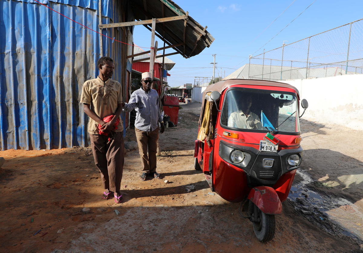 Mohamed Sheikh Yakub, a patient suffering with mental illness, is assisted outside the treatment room where a hyena believed to exorcise evil spirits that cause mental illness is secured in Hodan district of Mogadishu, Somalia February 15, 2020. Picture taken February 15, 2020. REUTERS/Feisal Omar
