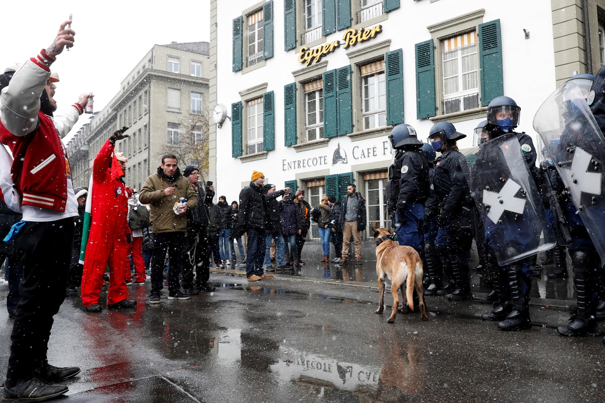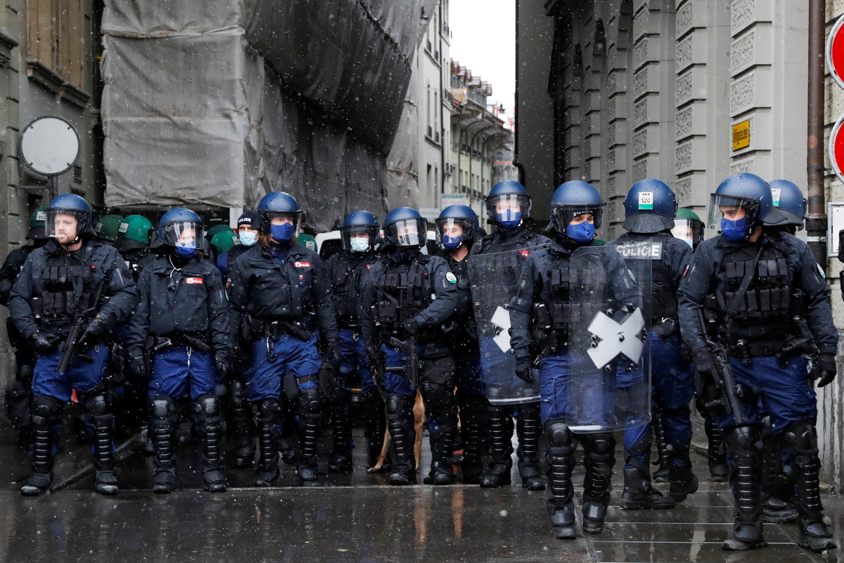Police officers stand in formation during a protest against a coronavirus disease (COVID-19) law that is voted on in a referendum, in front of the Swiss Federal Palace, the Bundeshaus, in Bern, Switzerland, November 28, 2021. REUTERS/Arnd WiegmannDemonstrators protest against a coronavirus disease (COVID-19) law that is voted on in a referendum, in front of the Swiss Federal Palace, the Bundeshaus, in Bern, Switzerland, November 28, 2021. REUTERS/Arnd Wiegmann