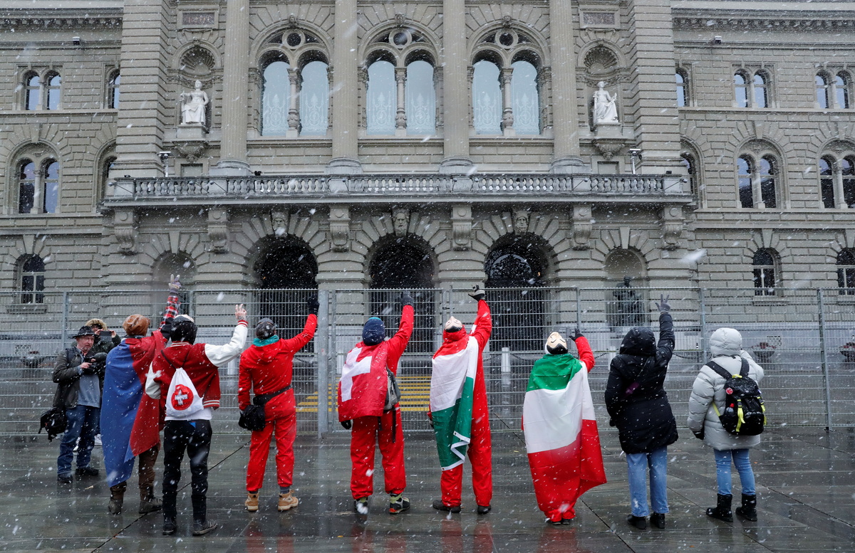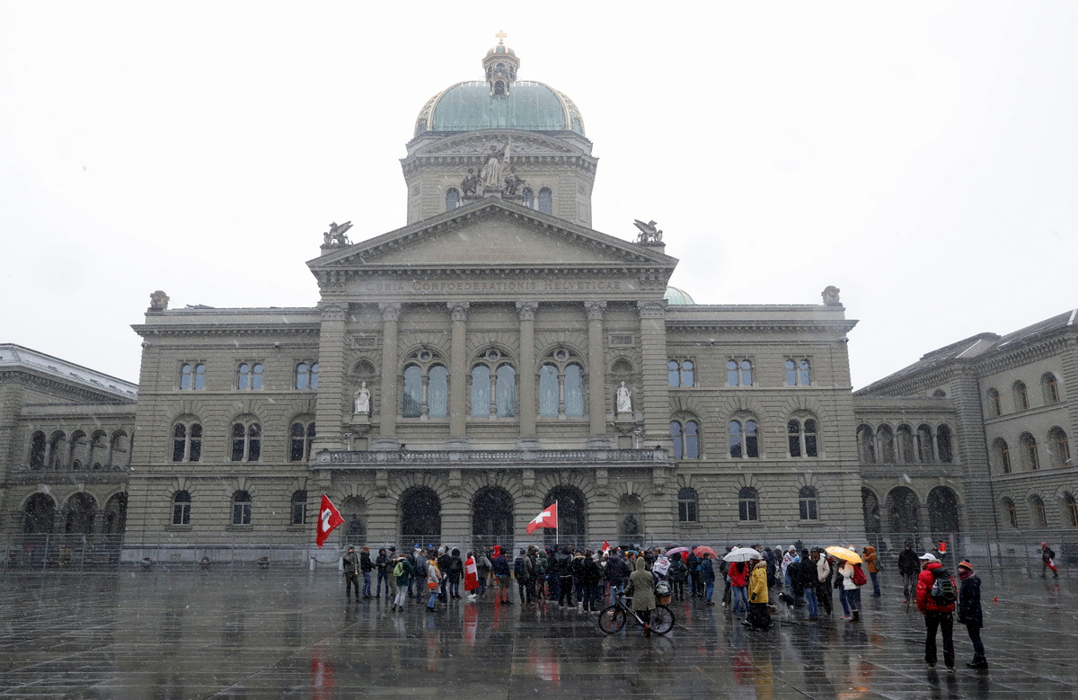 Demonstrators protest against a coronavirus disease (COVID-19) law that is voted on in a referendum, in front of the Swiss Federal Palace, the Bundeshaus, in Bern, Switzerland, November 28, 2021. REUTERS/Arnd Wiegmann