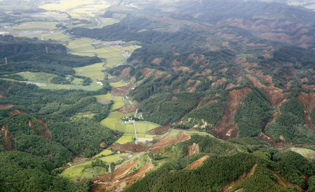 Aerial footage showed dozens of landslides exposing barren hillsides near the town of Atsuma in southern Hokkaido, with mounds of red earth and toppled trees piled at the edge of green fields.