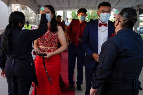 In Florida Sarasota County schools are allowing a prom but with no dancing and limiting the event to seniors. Several schools, including Fletcher High School in Duval County, are requiring students to quarantine for 10 days after the event. Many districts are holding their dances outdoors, including one on yacht and another in a football stadium.