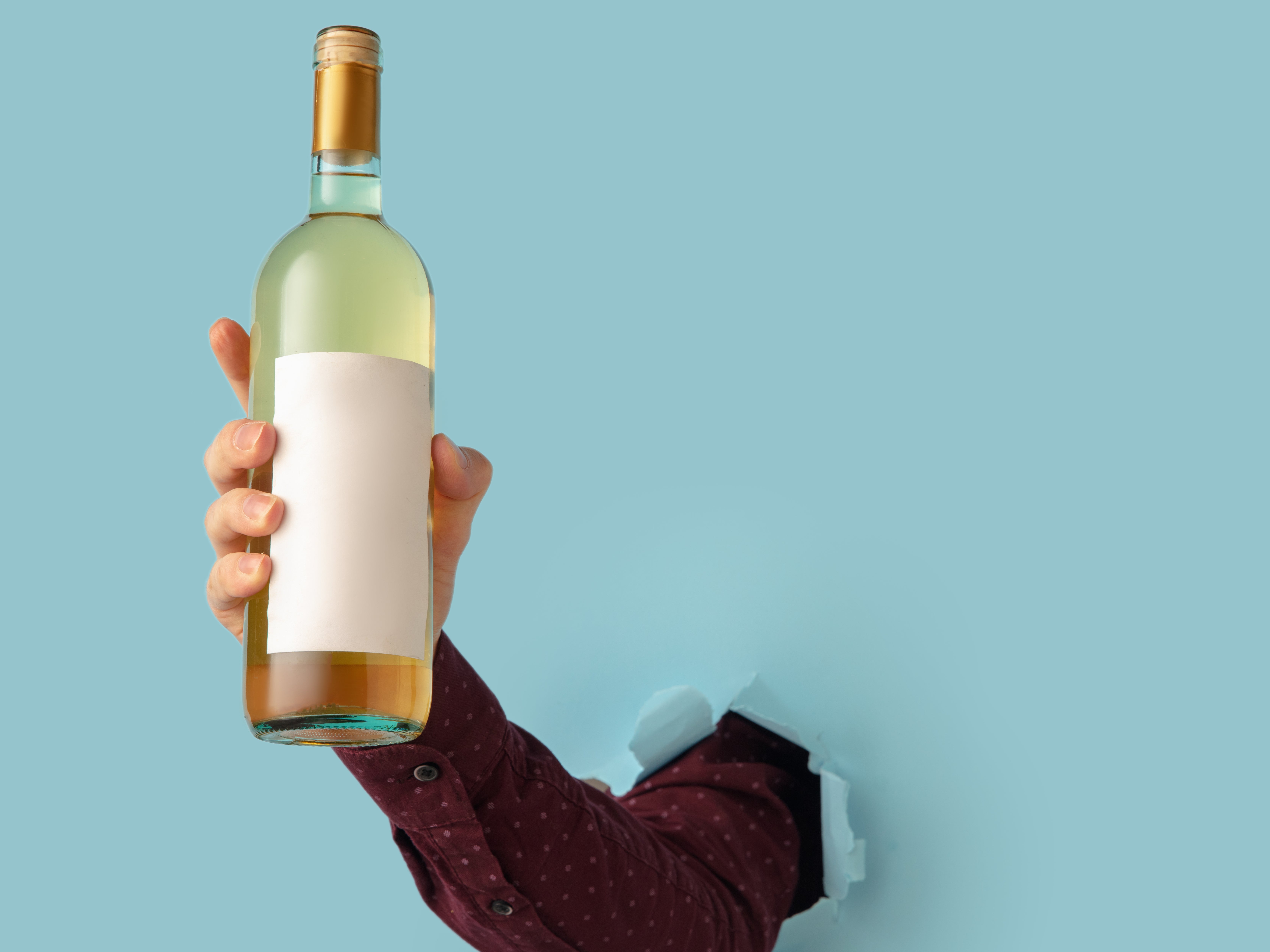 Man's hand holding bottle of wine and breaking through blue paper background.