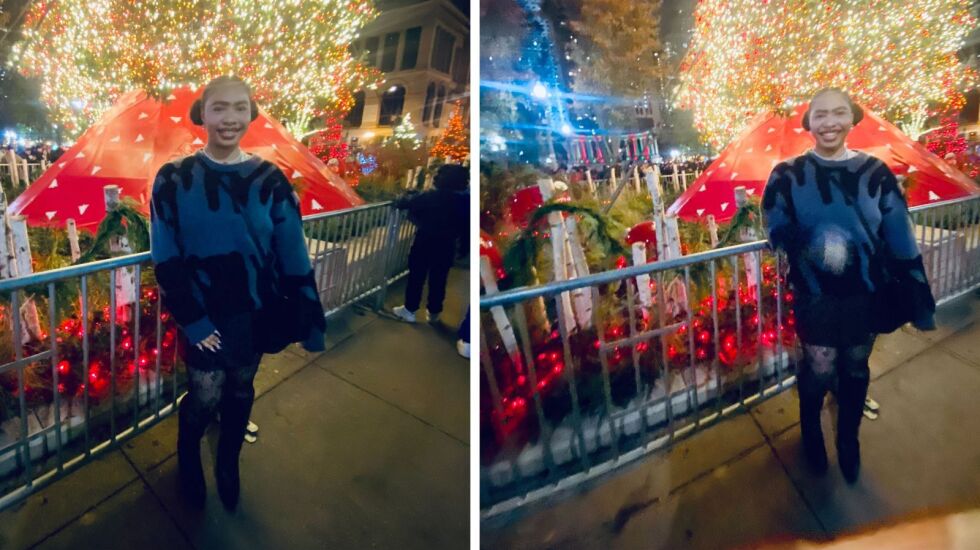 What motivated her to dress up that day? A recent sale and a picture-perfect opportunity. More specifically, she bought flashy boots a day before and hopped on a train with a friend the next day to take pictures with the Christmas tree at Millennium Park.