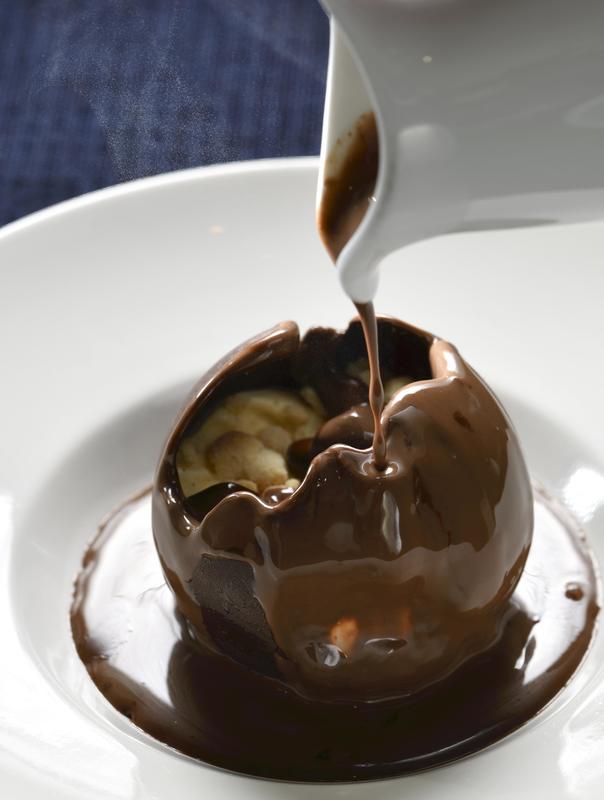At Debailleul, a pastry and chocolate shop in the Marunouchi district of Tokyo, a dish called "Avalanche" (1,350, yen about 12.5 dollars) is popular among customers. Pouring a cup of warm chocolate liquid over a spherical chocolate, its surface begins to melt and soon vanilla ice cream with added crumble appears inside.