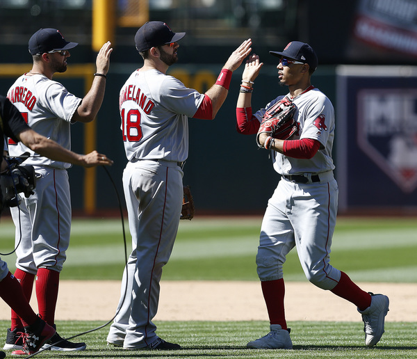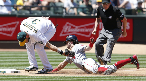 The home runs kept coming in the fourth inning. Mitch Moreland connected on a deep opposite field shot for the Red Sox to tie the game and the A's Chad Pinder followed up Trevor Plouffe's RBI double with his own long home run to left-center field as the A's were on top 6-3.
