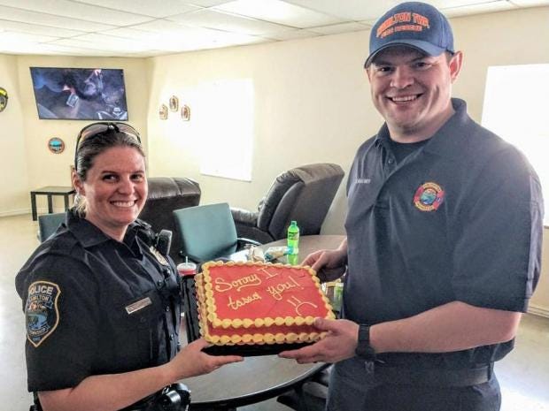 A photo on Hamilton Township Police Department’s Facebook page showed her handing over the cake, iced with a sad face and the words 'Sorry I tased you!'