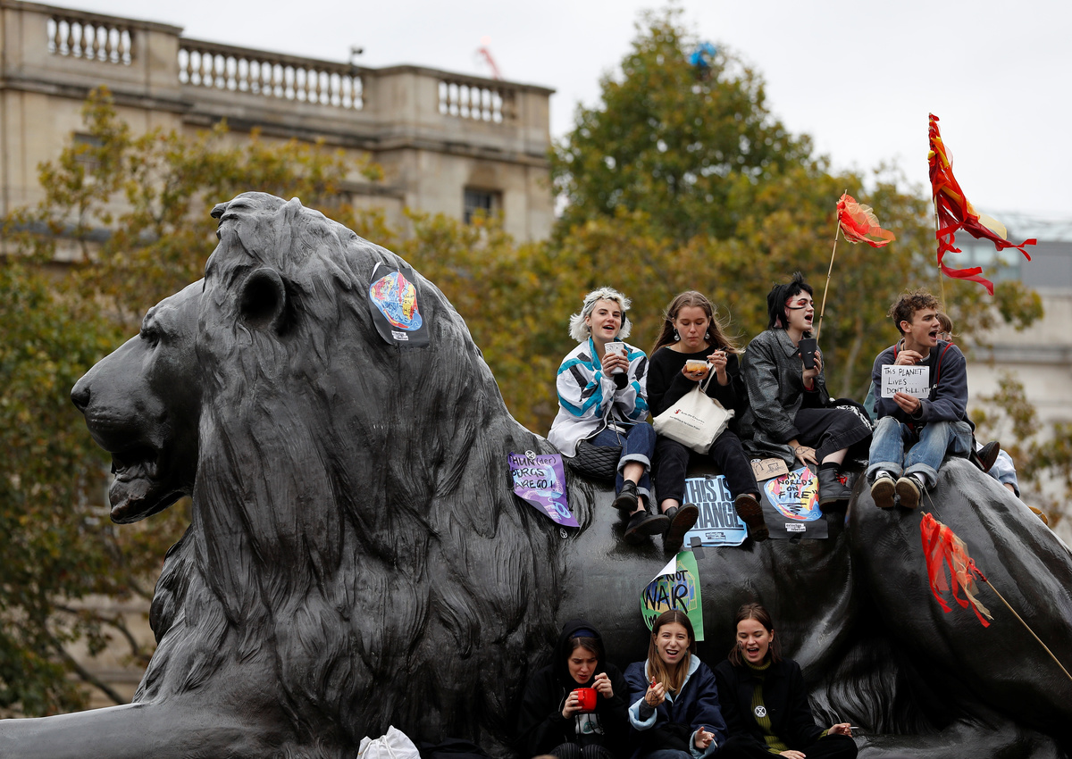 Banging drums and chanting, protesters in London took over Trafalgar Square and marched down the Mall, the avenue that leads to Buckingham Palace, carrying banners with slogans such as "Climate change denies our children a future unless we act now".