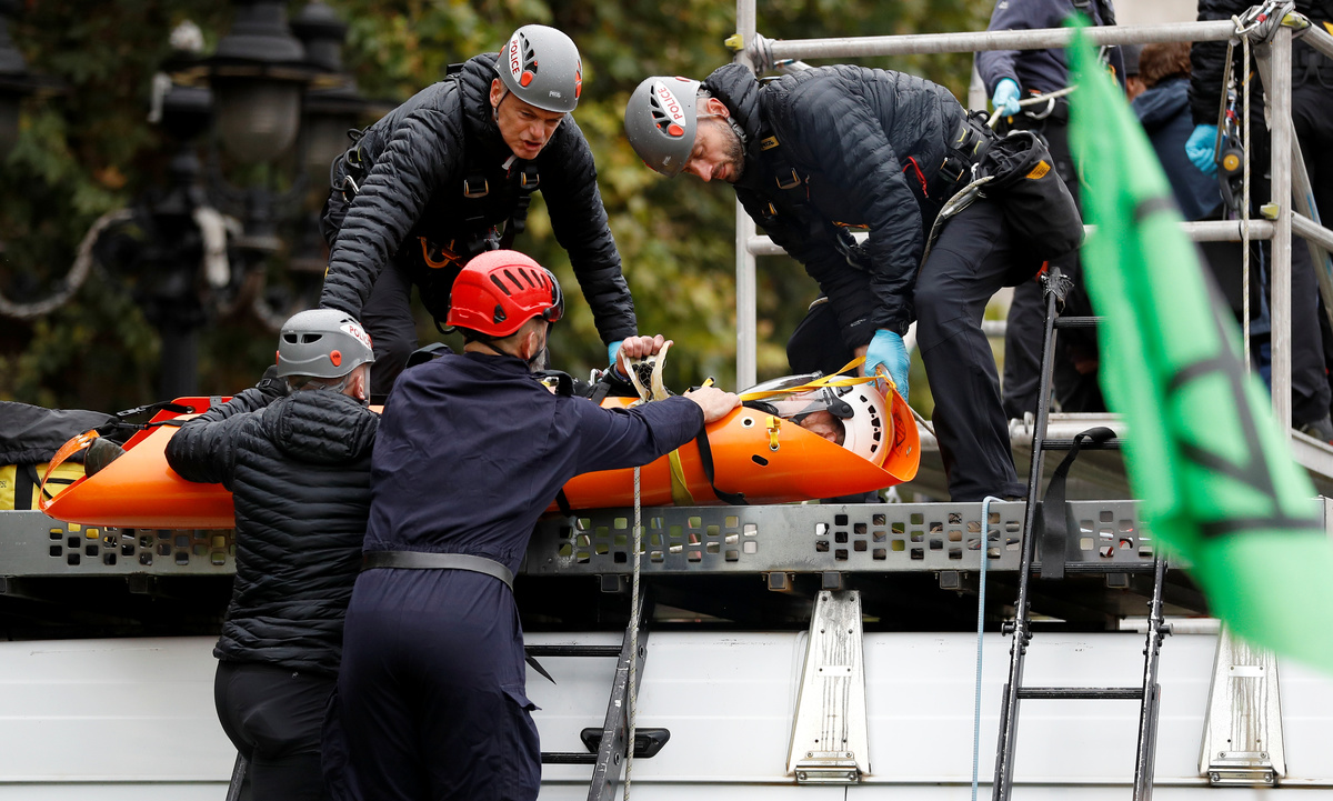 Meanwhile activists in London, some wearing yellow safety helmets with "Rebel at Work" painted on the side, glued or chained themselves to cars parked in the middle of roads or to street lamps, making it hard for police officers to detain them.