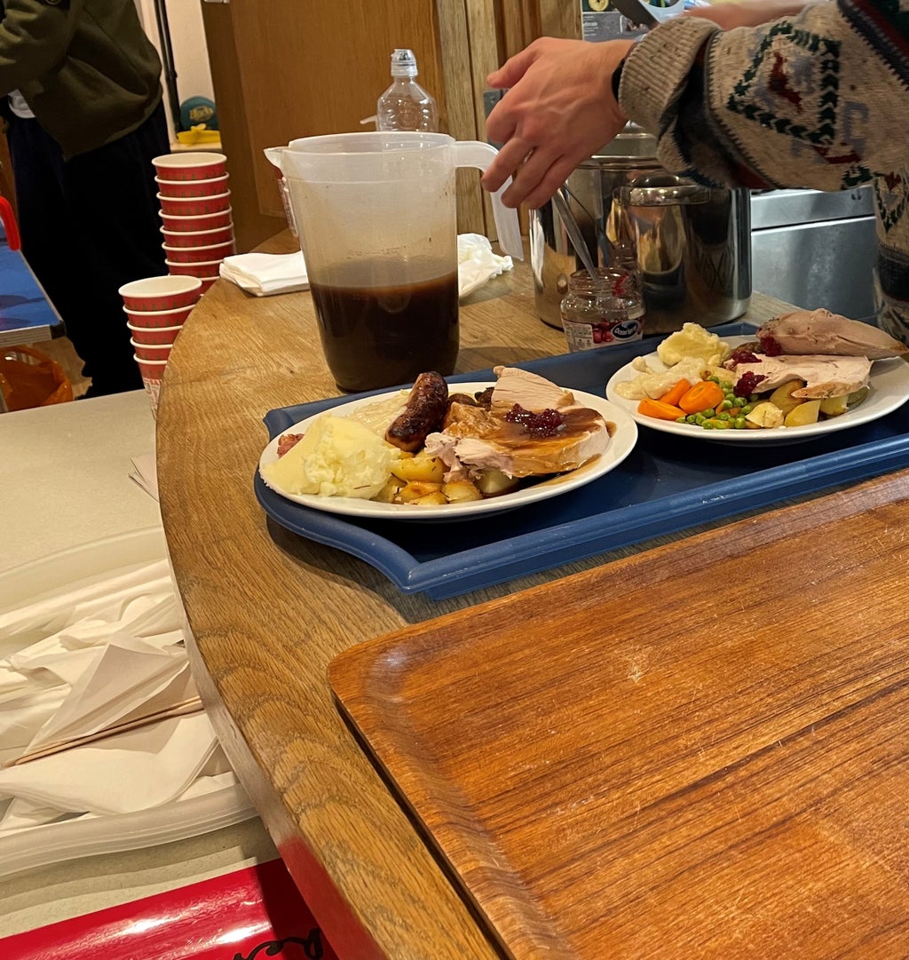 The main course consisted of turkey, bacon and sausages, with vegetables including roast potatoes and parsnips, and vegetarian and halal options were available.