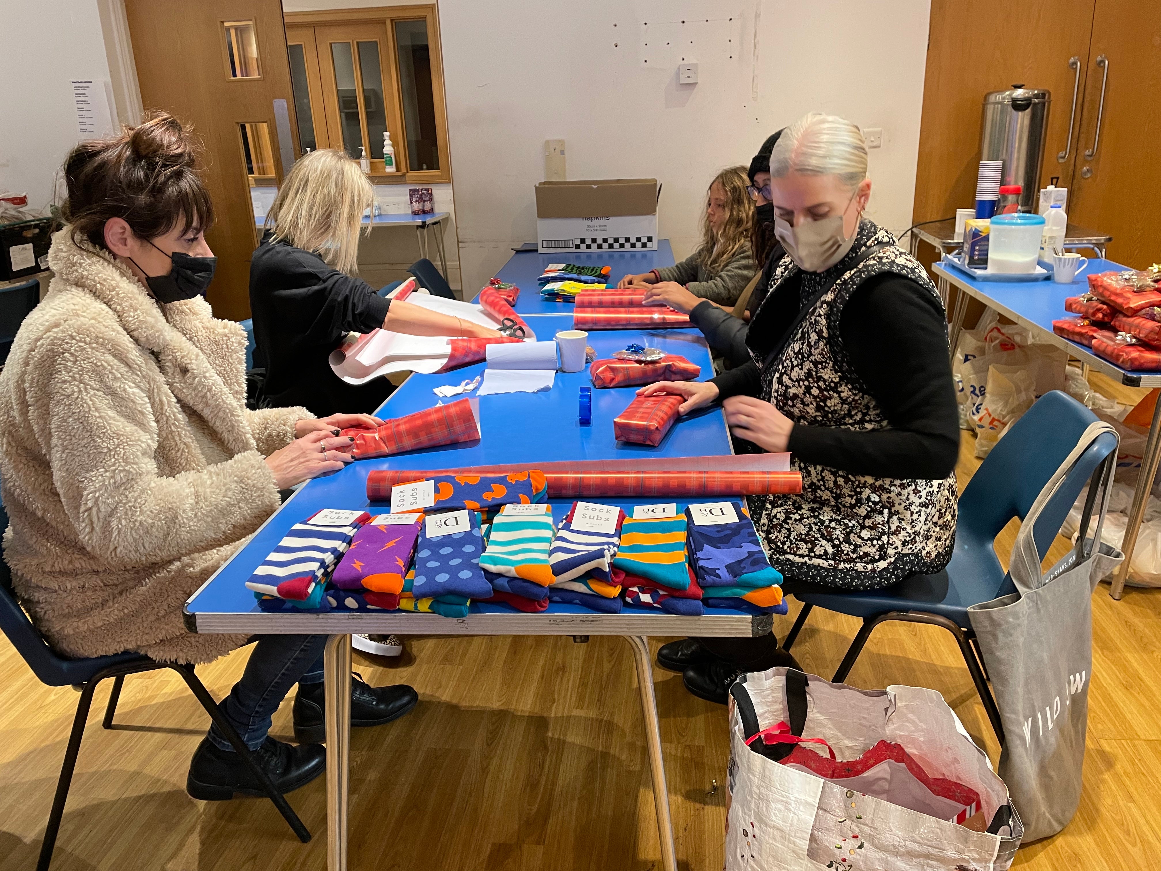 Volunteers wrapped socks donated by the clothing brand Sock Subs, complete with a ribbon and chocolates, to give as a present to the attendees and the 1994 festive hit Miracle On 34th Street was screened at the event.
