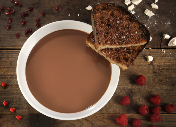 Spoon whipped cream into your soup _ some of us serve our bowls of soup with equally large bowls of whipped cream. Or add a thick slice of rye or whole wheat bread. Toast or broil a slice, grate chocolate over the top, drizzle on some olive oil and add a confetti of Maldon salt _ Ferran Adria famously made this Catalonian children's favorite for family meals at the late El Bulli _ and you pretty much have breakfast. Which is maybe the romantic kind of meal you want from this anyway.