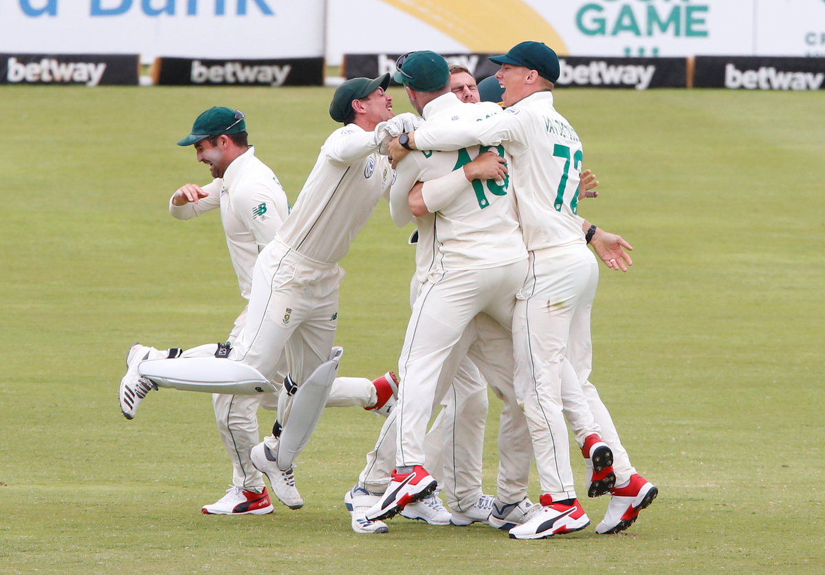 Cricket - South Africa v England - First Test - Supersport Park, Centurion, South Africa - December 29, 2019 South Africa's Dwaine Pretorius celebrates takes a catch to dismiss England's Jos Buttler with teammates, off the bowling of Kagiso Rabada REUTERS/Rogan Ward