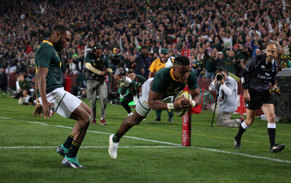 Four minutes afterwards, De Klerk kept front-foot ball going for the Boks and Nkosi went over on the other wing after a sharp inside pass from fellow debutant Dyantyi.