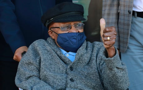 He was rolled in a wheelchair into a vaccination center in Cape Town where he and his wife, Leah, were among those getting shots.