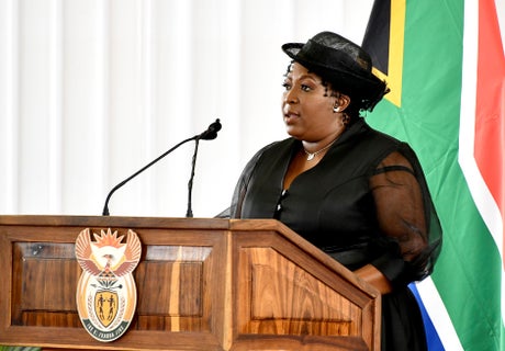 Refilwe Mtsweni-Tsipane was seen on a live state television broadcast violating the country s COVID-19 regulations by not wearing a mask and hugging a police officer. She was attending the funeral of Cabinet minister Jackson Mthembu, who was buried Sunday after dying of COVID-19 last week.