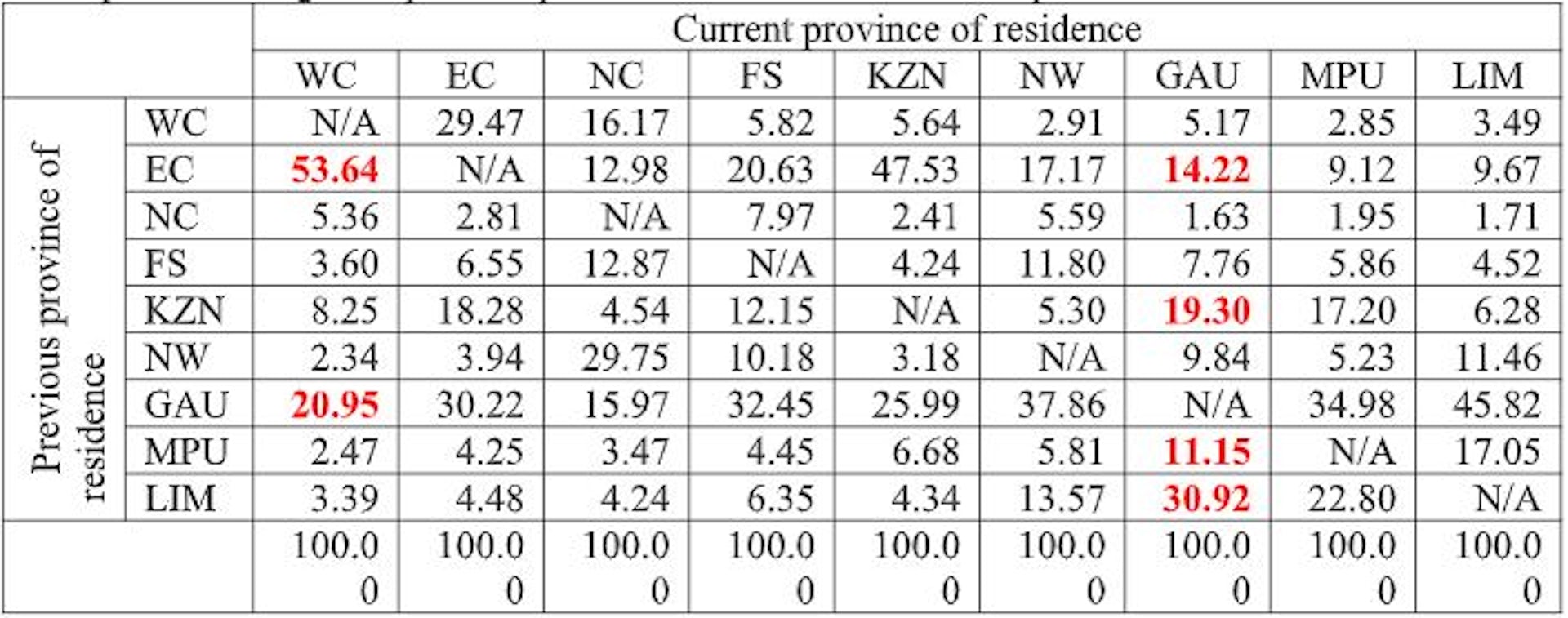 The majority of migrants into the Western Cape came from the Eastern Cape (53.64%) and Gauteng (20.95%). In contrast, migrants into Gauteng were more evenly spread. They came mostly from Limpopo (30.92%), KwaZulu-Natal (19.30%), the Eastern Cape (14.22%) and Mpumalanga (11.15%) provinces.