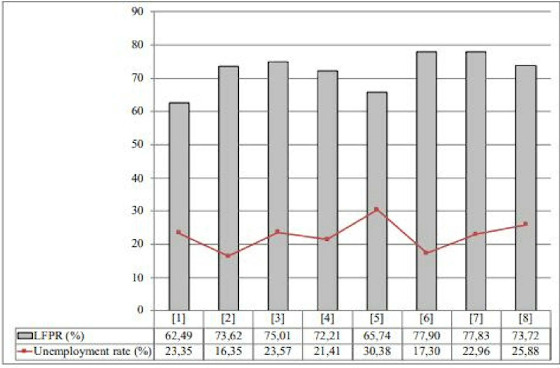 Labour force participation rates and unemployment rates of the eight groups of individuals