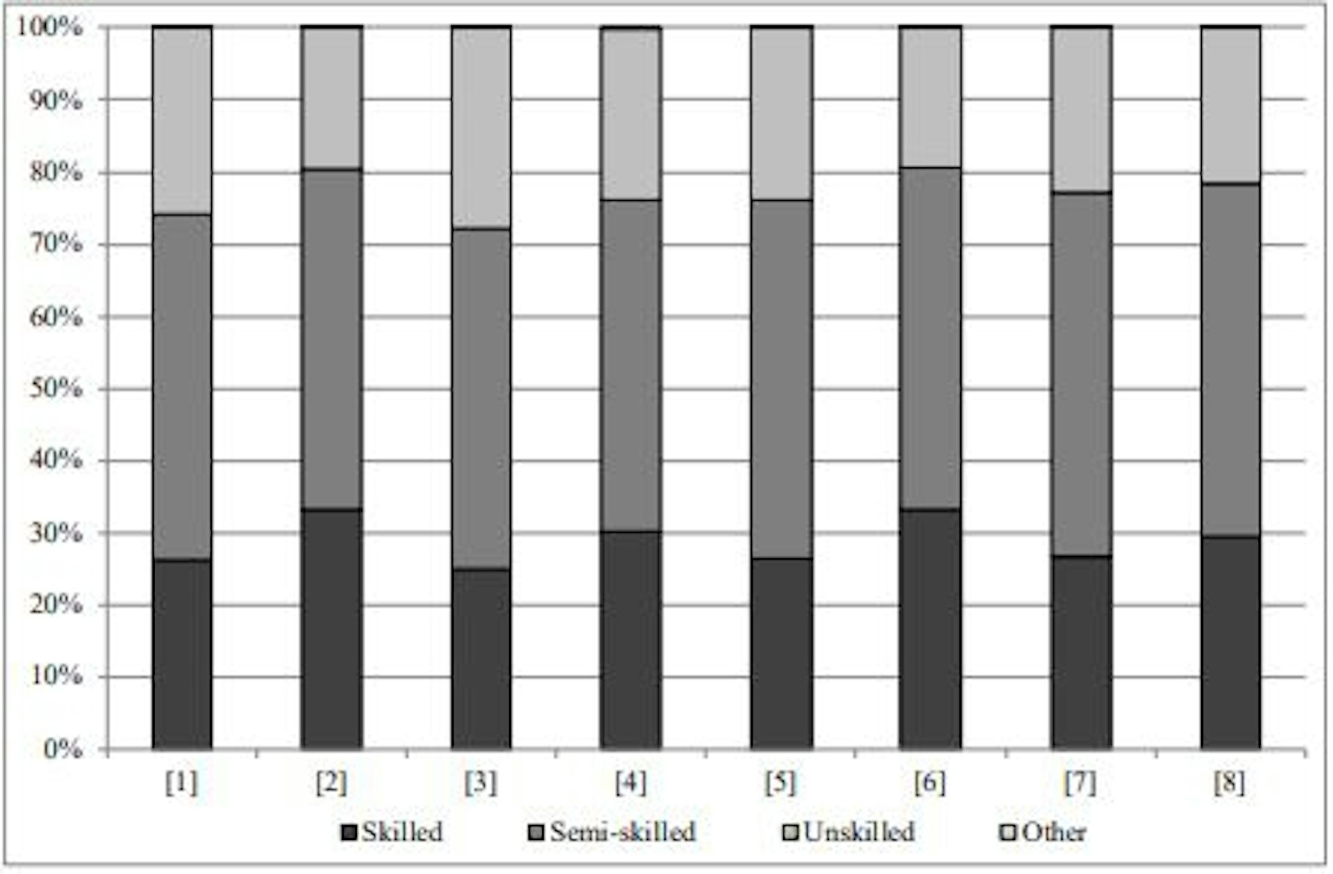 The figure below shows that the proportion of workers involved in skilled occupations was the highest for the intra-provincial migrants. More short-term and long-term inter-provincial migrants were in skilled work compared to the permanent residents.
