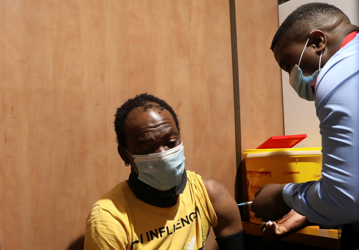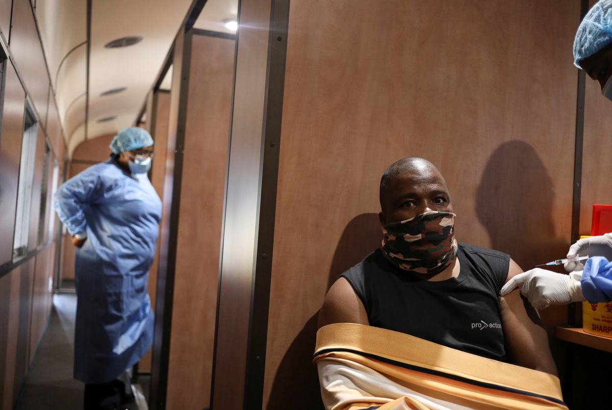 Dennis Malattji takes his coronavirus disease (COVID-19) vaccine while a health worker looks on inside the Transvaco COVID-19 vaccine train, as South Africa's rail company Transnet turned the train into a COVID-19 vaccination center on rails to help the government speed up its vaccine rollout in the country's remote communities, at the Springs train station on the East Rand, South Africa, August 27, 2021. Picture taken August 27, 2021. REUTERS/Siphiwe Sibeko