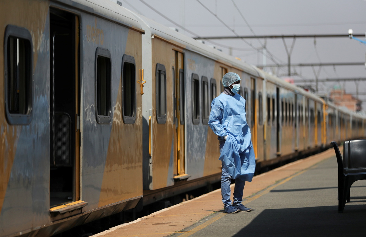 A health worker takes a break, as South Africa's rail company Transnet turned a train (not in the picture) into a coronavirus disease (COVID-19) vaccination center on rails to help the government speed up its vaccine rollout in the country's remote communities, at the Springs train station on the East Rand, South Africa, August 27, 2021. Picture taken August 27, 2021. REUTERS/Siphiwe Sibeko