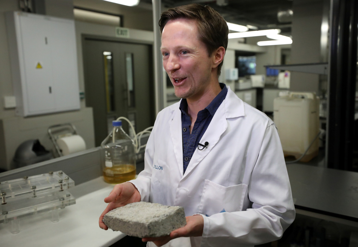 The grey bricks are produced in a lab over eight days using urine, calcium, sand and bacteria. Fertilizers are also produced during the processes. And no, the bricks do not smell.