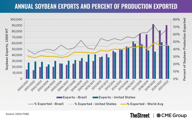 Although Brazil overtook the United States as the world’s foremost soybean producer only in the last five years, Brazil exceeded the United States in exports one half-decade before. Brazil has exported, on average, 53% of its production in the 21st century; and in the 2021/2022 crop year, the country exported 68% of its production. Brazilian exports as a percentage of domestic production generally exceed the U.S. share of production exported, as well as the average export share among soybean-producing nations globally.